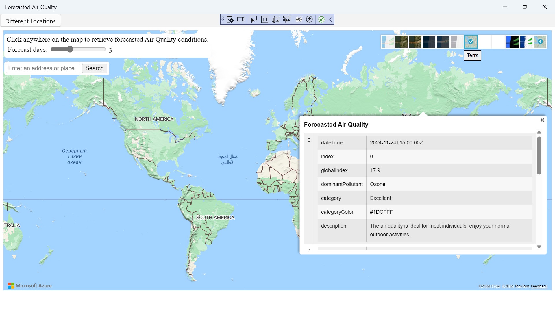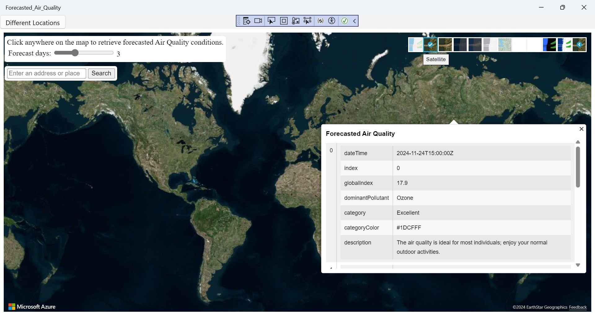 Forecasted Air Quality is a app where you can click on the search bar button to search anywhere in the world to check the weather predictions left click on mouse to get a reading result to check the weather. Scroll with your mouse wheel up and down and zoom in and out to see city's towns roads buildings bridges terrain oceans from a satellite view from space You can change the different types of layers of maps by going to the right top corner of your screen Weather and other conditions data is updated at least once an hour