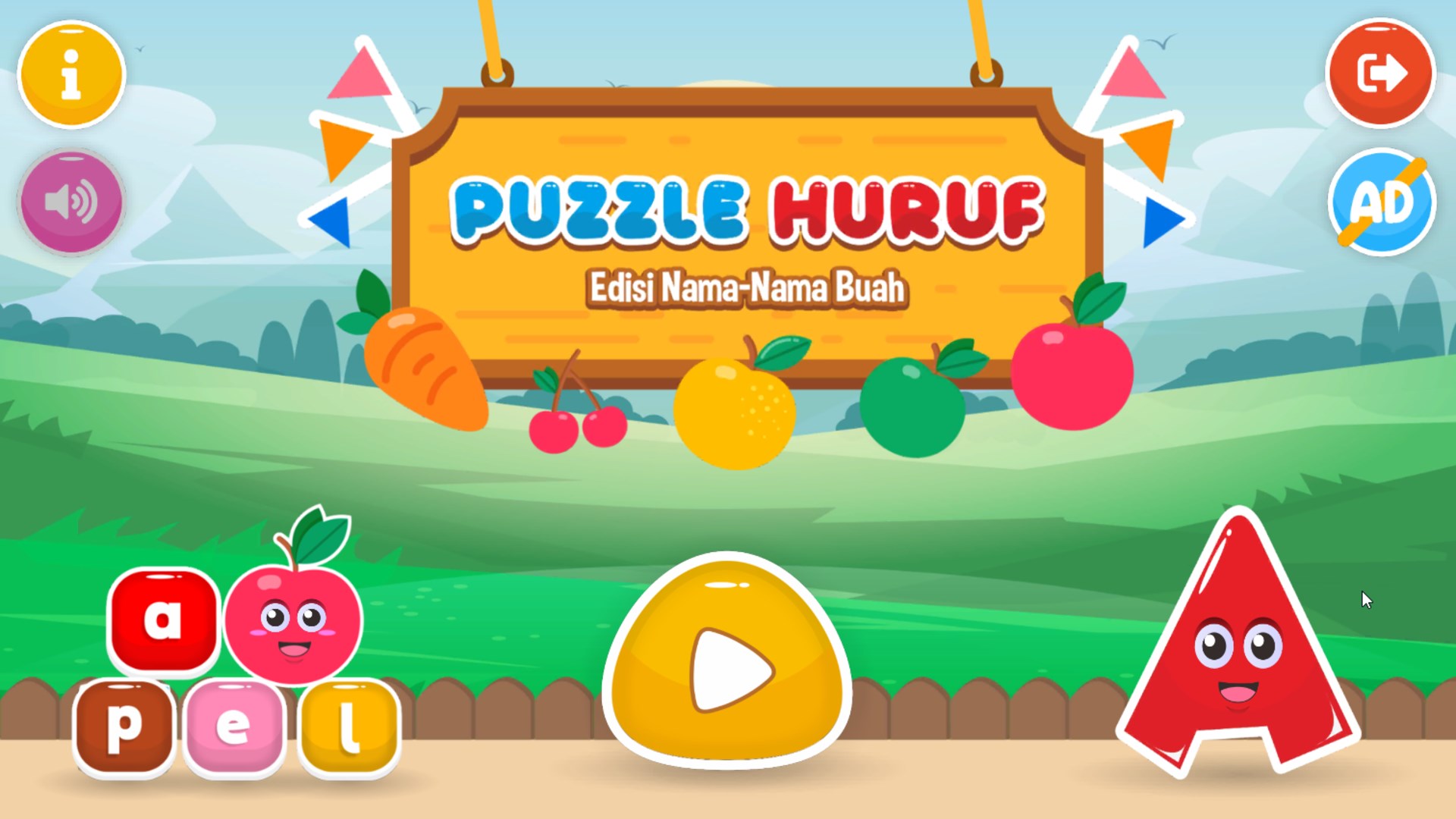 Game Puzzle Huruf dan Tebak Gambar Buah berisi permainan yang mendidik untuk anak usia 4-7 tahun untuk berlatih menyusun huruf menjadi sebuah kata dengan cara yang seru. Game ini dalam edisi buah-buahan jadi kata yang disusun nanti adalah kata buah-buahan sehingga berguna pula untuk mengenalkan nama-nama buah kepada anak-anak. Selain itu terdapat juga permainan tebak gambar nama buah, disini anak-anak dapat menebak gambar buah sesuai dengan suara yang di bunyikan.