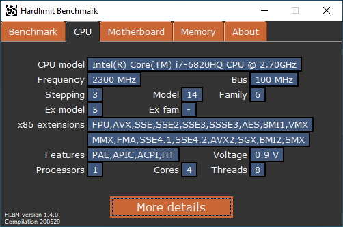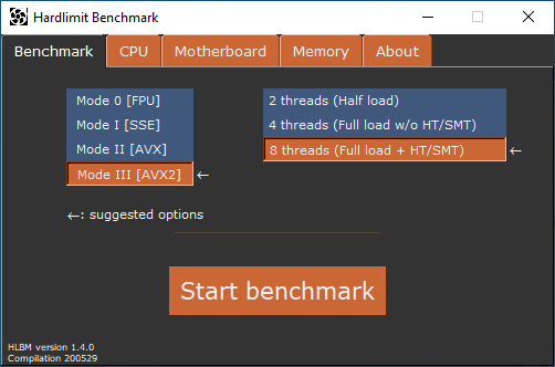 HLBM is a CPU benchmark intended to measure the performance of a CPU in multiple areas. You can choose the x86 instruction set extension such as SSE or AVX to test how good are them for some operations. Furthermore, you can test how fast is your processor by executing old instructions sets. Remember: not all sofware is compiled for AVX2.