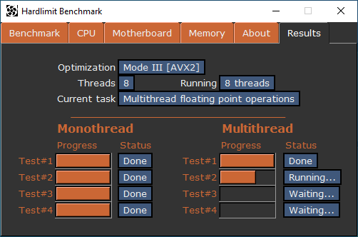·Test#1 and #2: will evaluate the performance in the execution of SIMD entire and floating point operations. These tests will improve dramatically its results by setting a higher mode. The result will show you how fast is your CPU for multimedia and games.