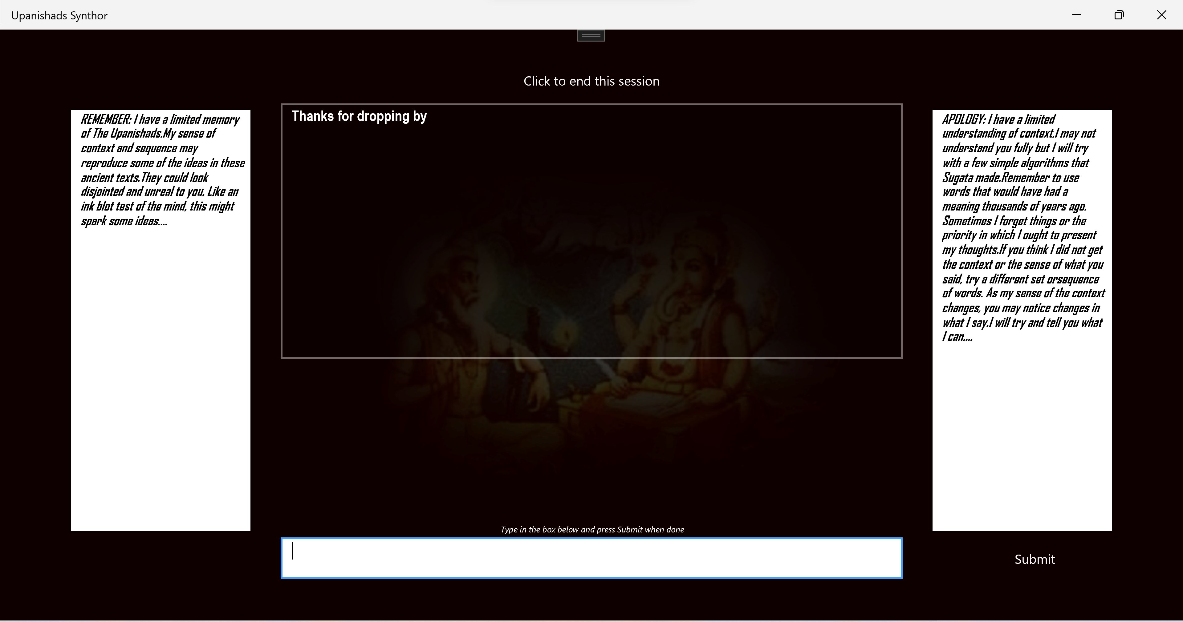 This Synthor provides the original thoughts and contents of the Upanishads, much as a person who has read them, would. It is a deep dive into the minds of people who lived and taught thousands of years ago. You can text chat with these authors using the app and the experience can be sometimes bewildering and mostly mind-blowing. Go ahead and plunge in....