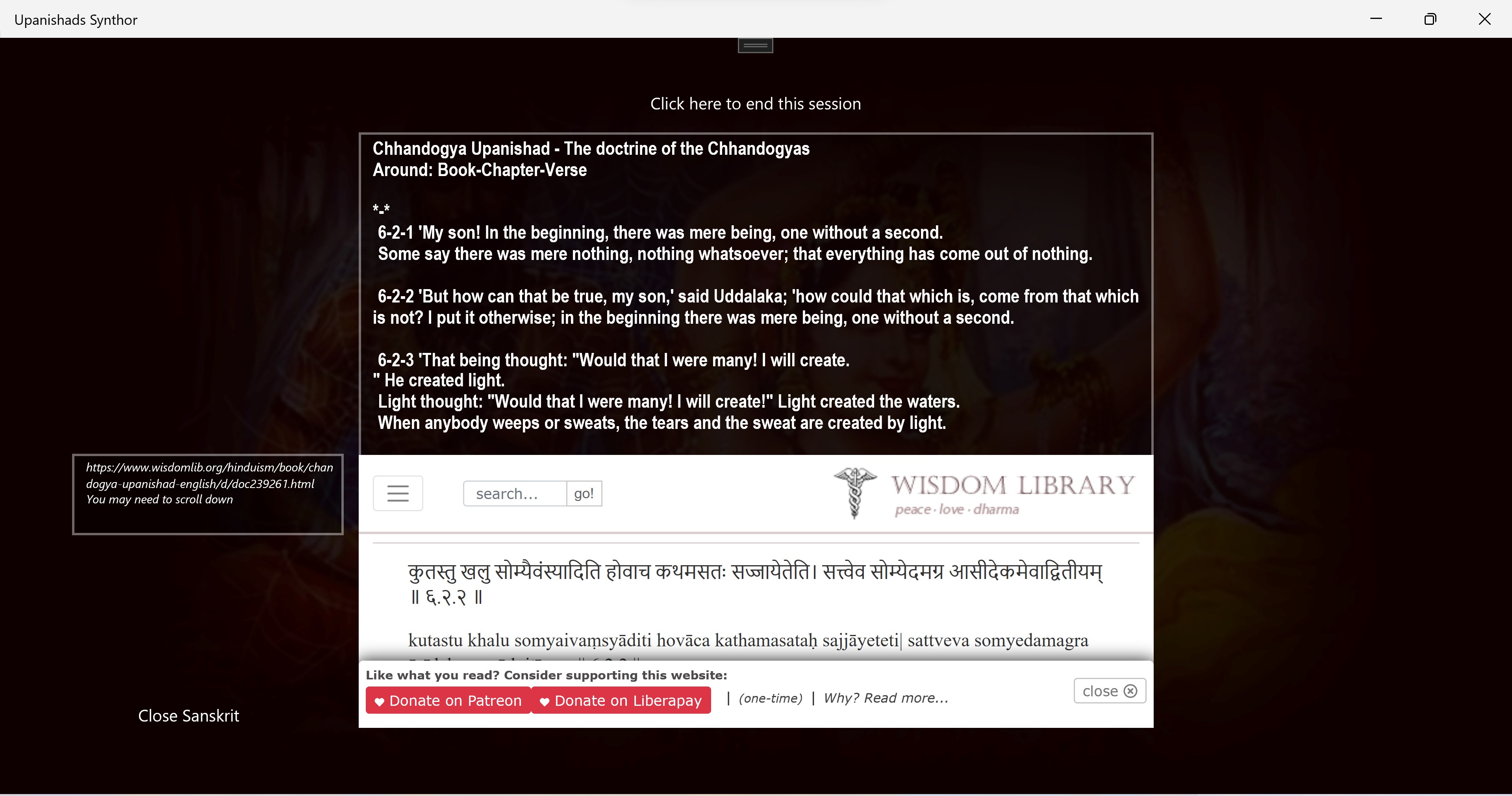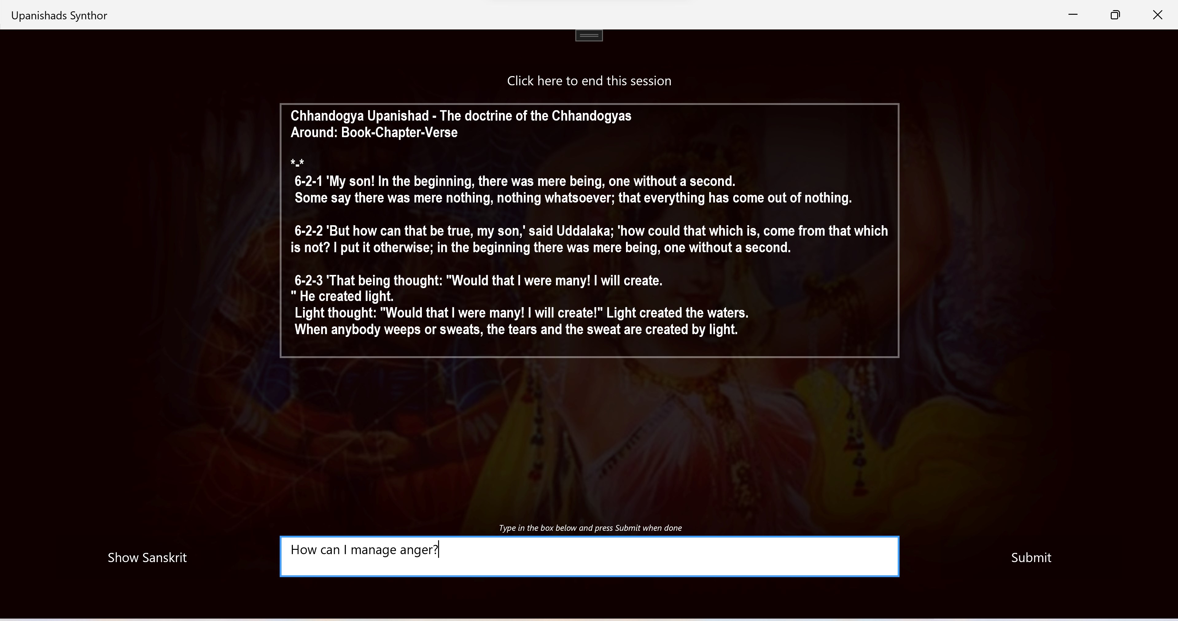 Displays English translation from the Upanishads as answers to your questions.Can show you the original Sanskrit text and help you read it. Provides references to books, chapters, Cantos and verse numbers that are hard to get otherwise.Provides deep answers to simple everyday questions about values.Quotes from conversations with fascinating people form thousands of years ago, so you can glimpse their minds and attitudes.