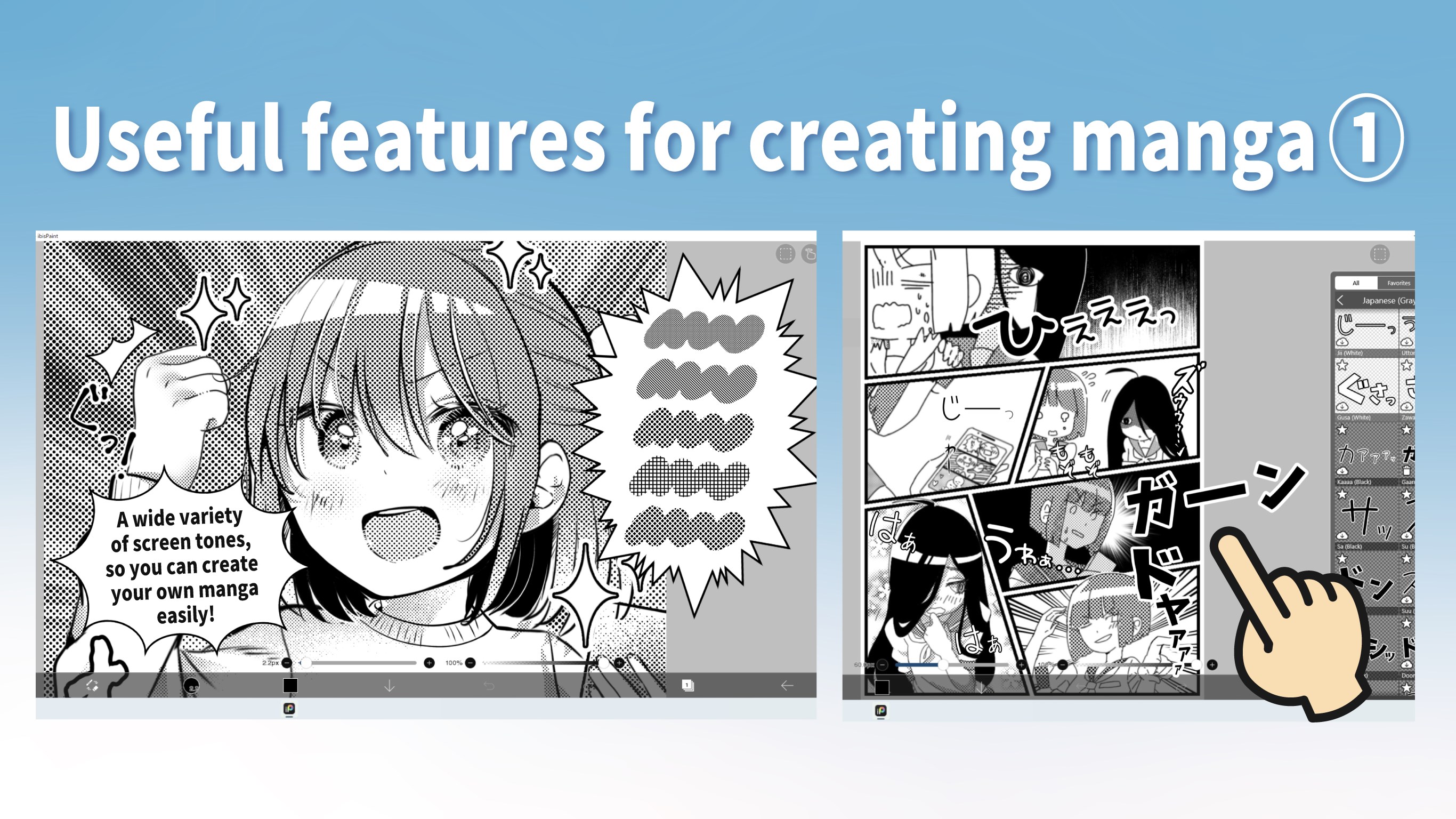- 46 screen tone functions such as Dot, Noise, Horizontal, Vertical, Slash, Cross, Square, etc.