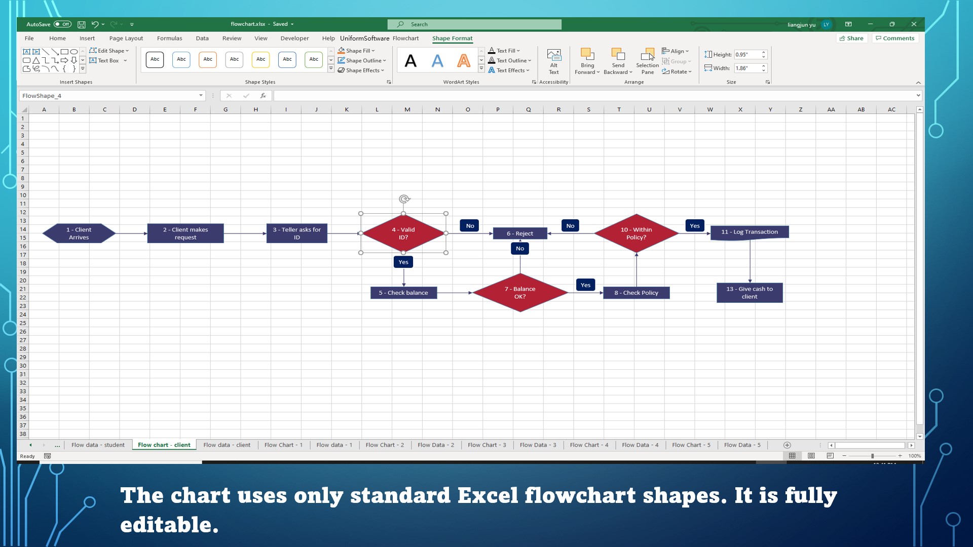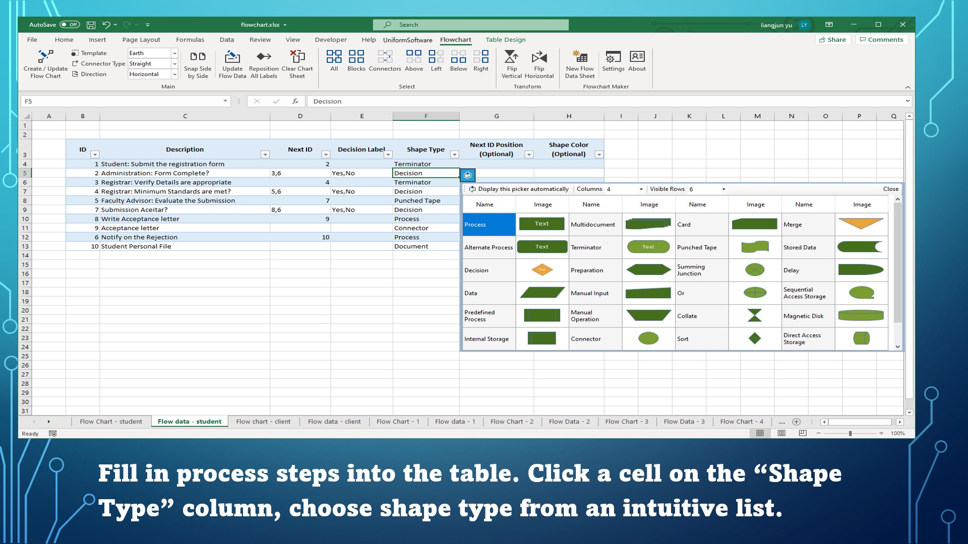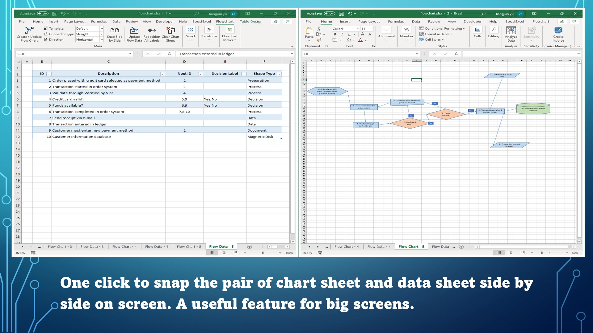 Make editable flowcharts from a step list in Excel.Automatic layout algorithm to reduce cross connectors.Intuitive shape picker.Snap the chart sheet and data sheet side by side on screen.Reposition all decision labels with one mouse click.Multiple configurable legend templates. It\'s easy to apply your own business or brand color scheme.