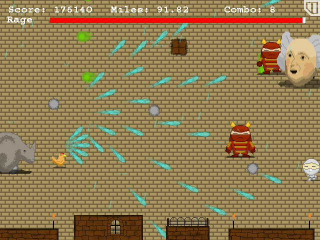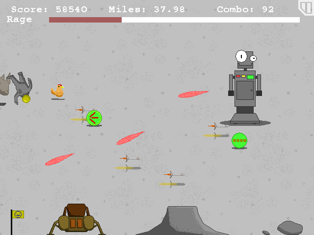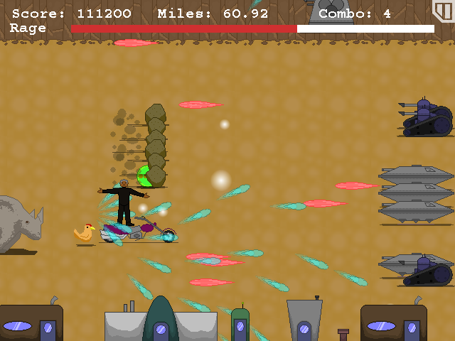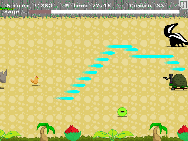 Move mouse up and down to move. Pickup the green balls to get one of three powerups. Get a combo of 20, or 100 to get a combo beem. Combo beem can destroy enemy attacks. Getting hit by a block or an enemy attack with slow you down for a short time. It you get hit to many times the rhino will catch up with you and the game will be over!