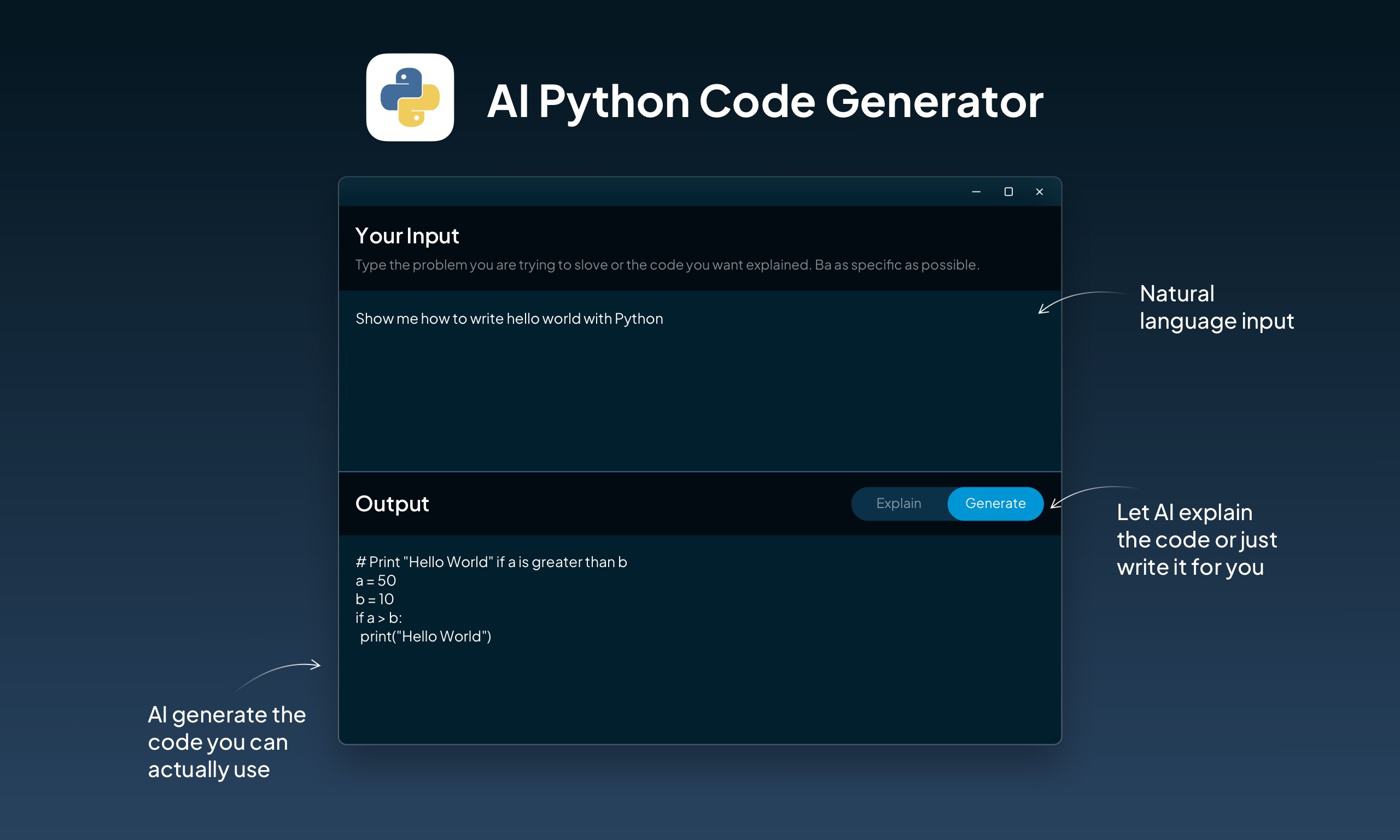 Unlock the power of AI technology to generate custom Python code with ease using Python AI Code Generator.