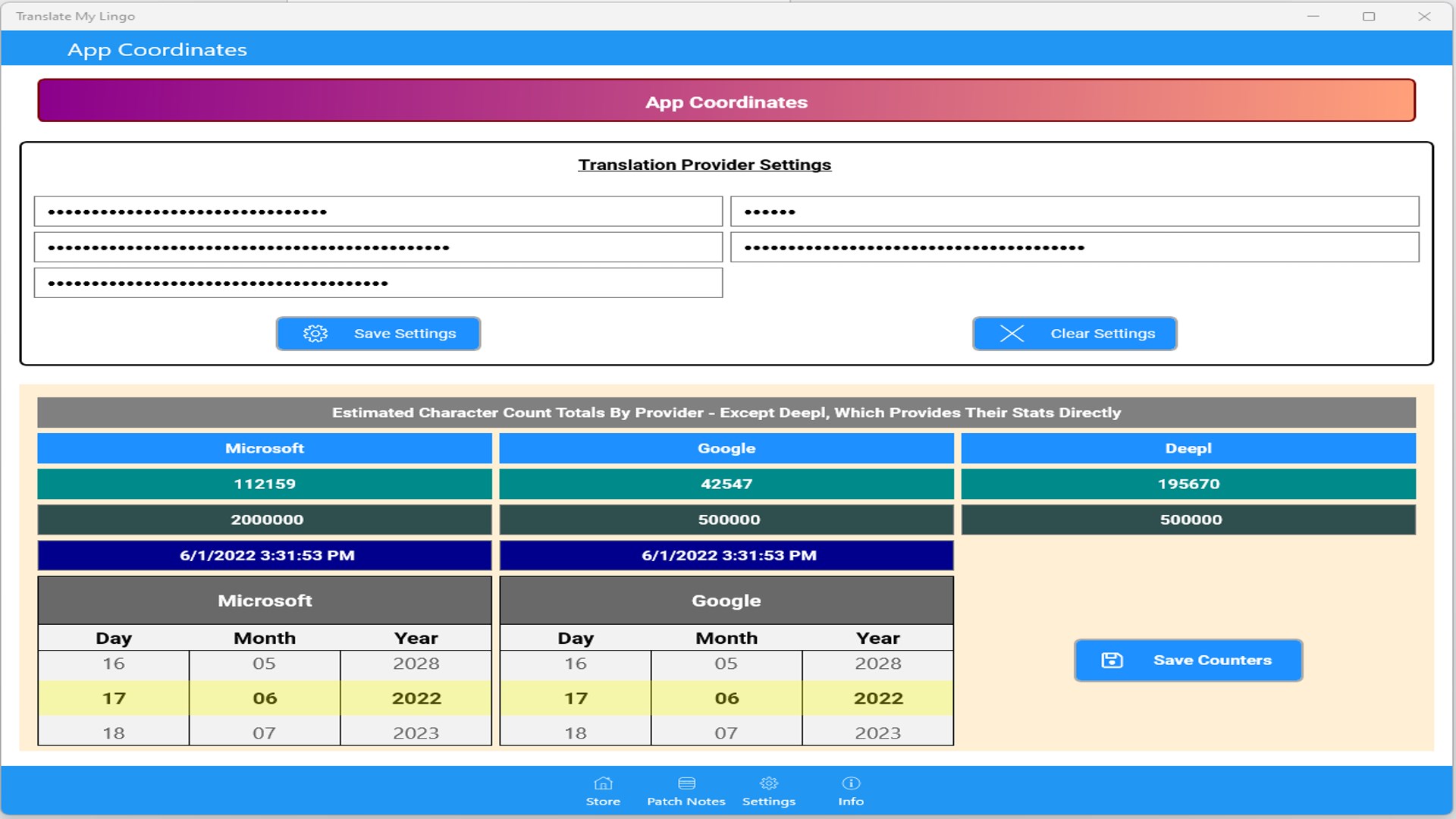 Added counters and subscription management information to Settings Tab. Added Deepl Free API translation support for a third translation engine. Spread the translation task across all three to make the free services of all three last much longer over time. With the counters in the settings page you can keep track of what you are using as you go along and make decisions based on those metrics.