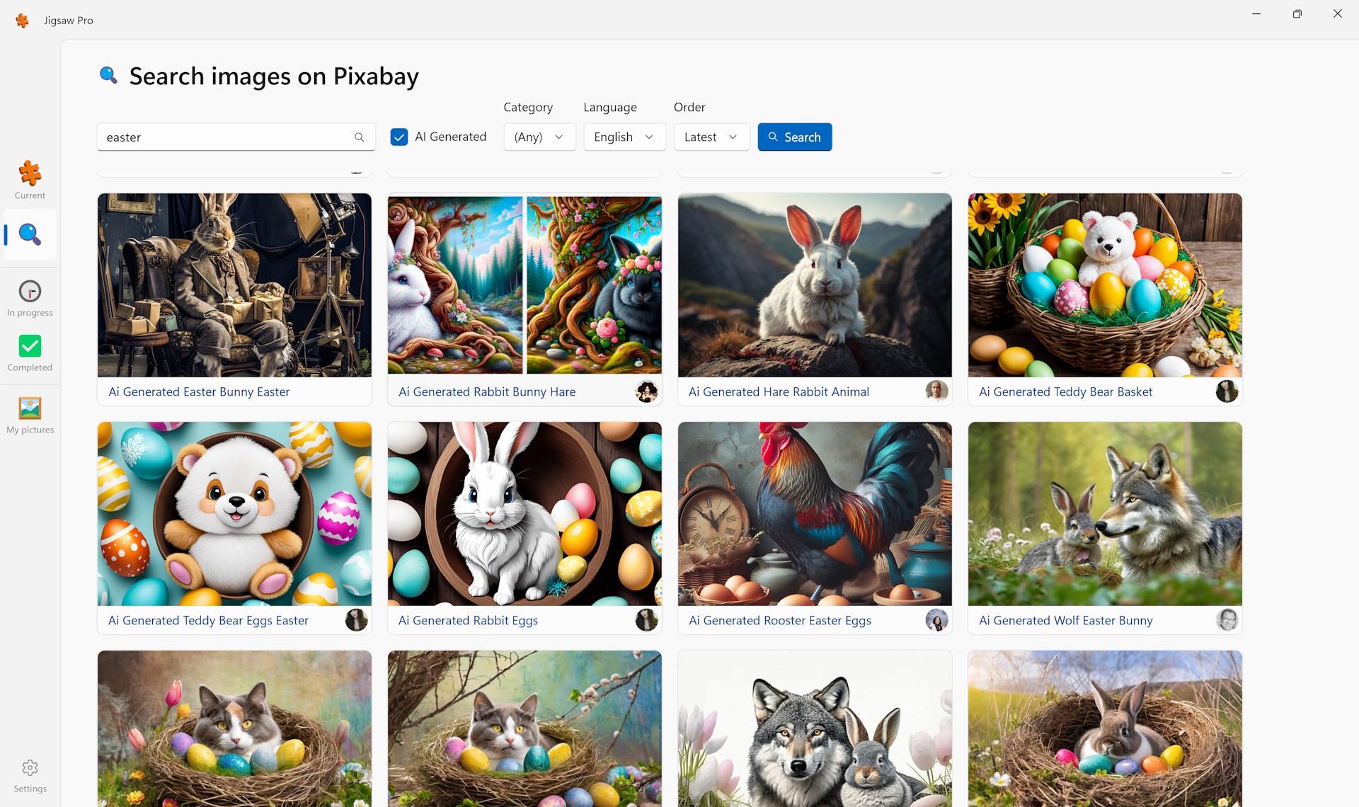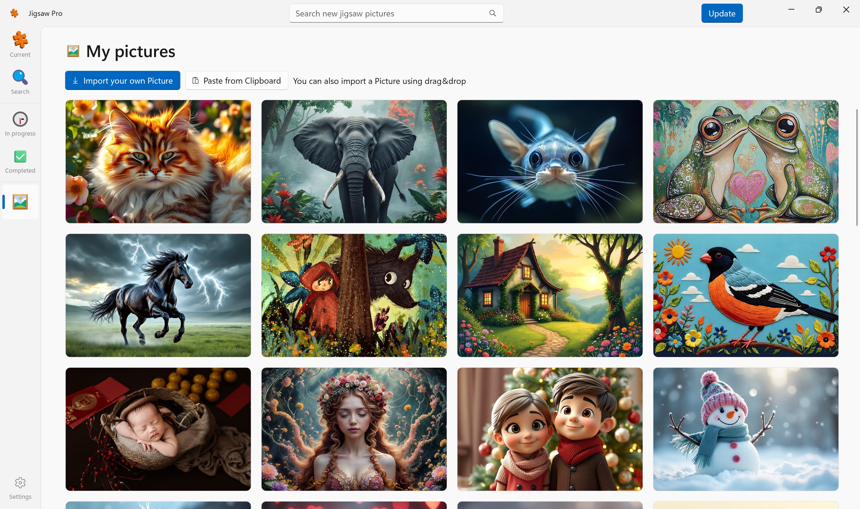 There are over 4 million high quality pictures available using the powerful search feature. You never run out of new puzzles. You can also import your own photos if you want.