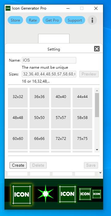 And pre-installed with some commonly used icon sizes, can also be added or modified according to their own needs.