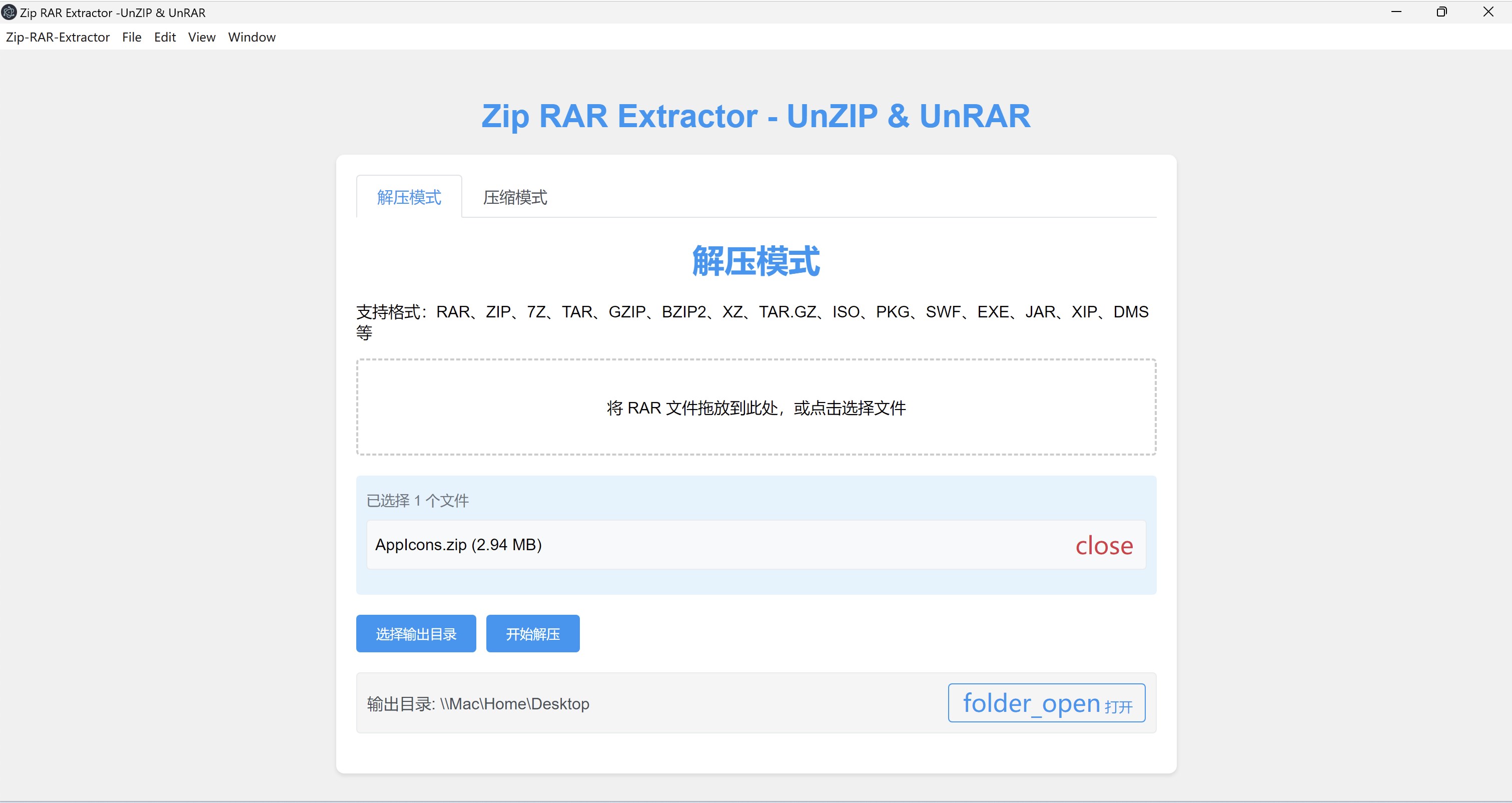 Decompression functionSupports multiple compression formatS: RAR, ZIP, 7Z, TAR, GZIP, BZIP2, XZ, TAR.GZ, ISO, PKG, SWF EXE, JAR, XIP, DMs, etcSupports batch decompression, up to 100 files can be processed at a time