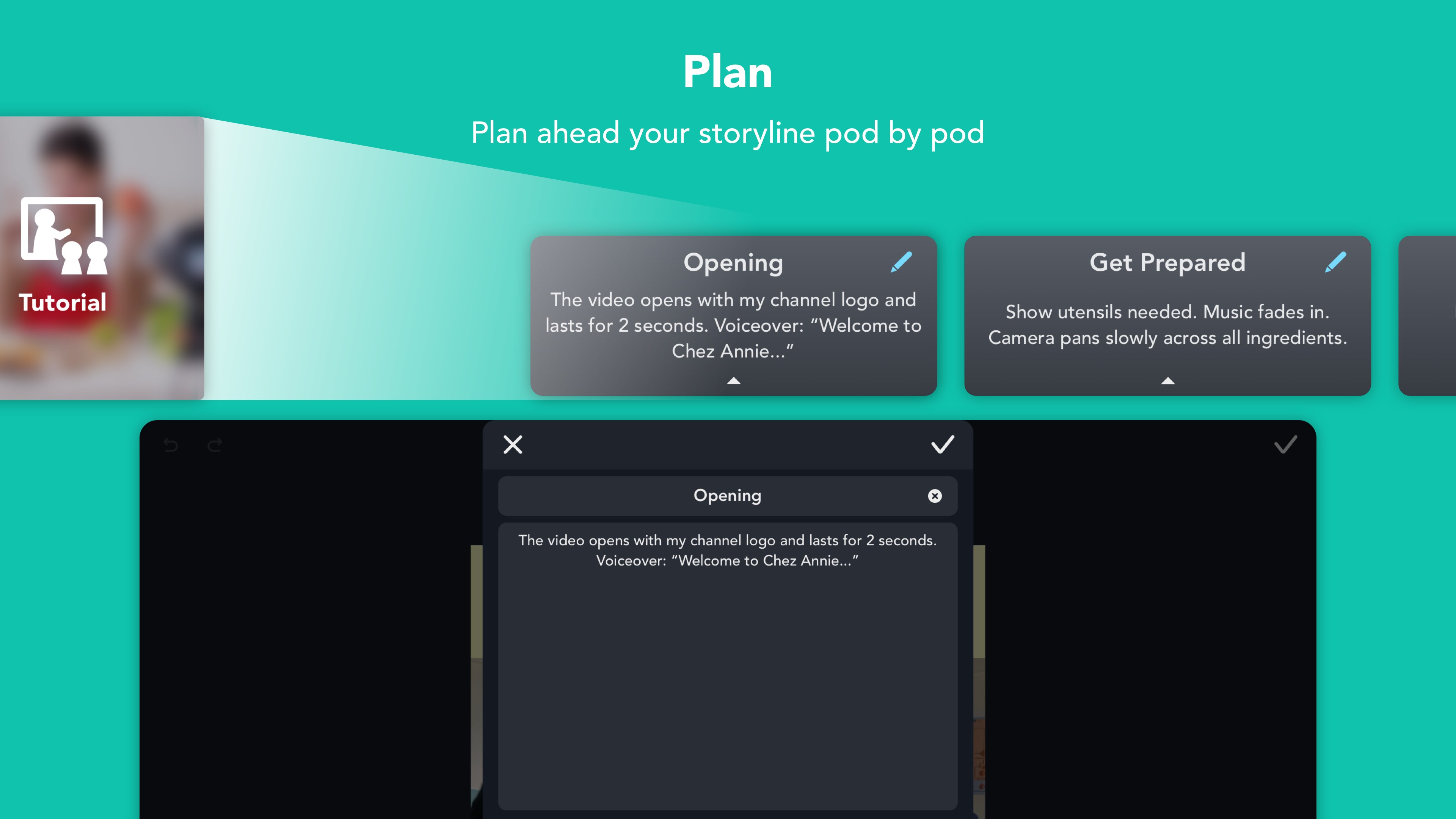 Plan your video outline with \“Pods\”Create and organize your shot lists with \“Pods\”Create a storyboard with pictures and text notes before shooting a videoChange video background colorsRotate or resize a videoImport videos, images, audio files, and audio recordings into a video projectTrim and merge video clips