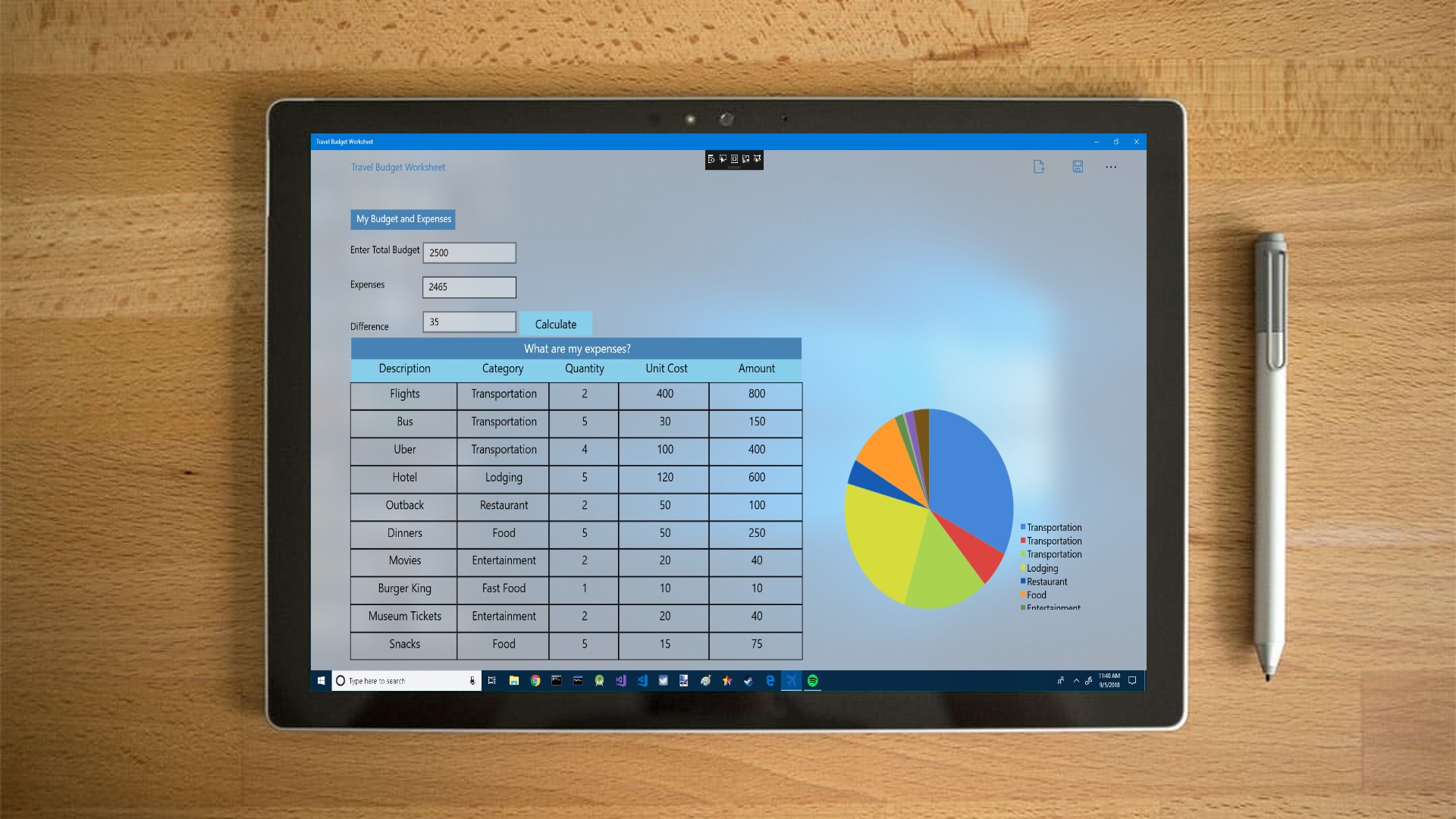Have you ever wondered how much you're spending on the road? Well, this application will help you keep track of how much you're spending, while traveling. You simply enter your budget, and your expenses. A pie chart will appear after calculating your expenses, and you can see how much you're spending, .