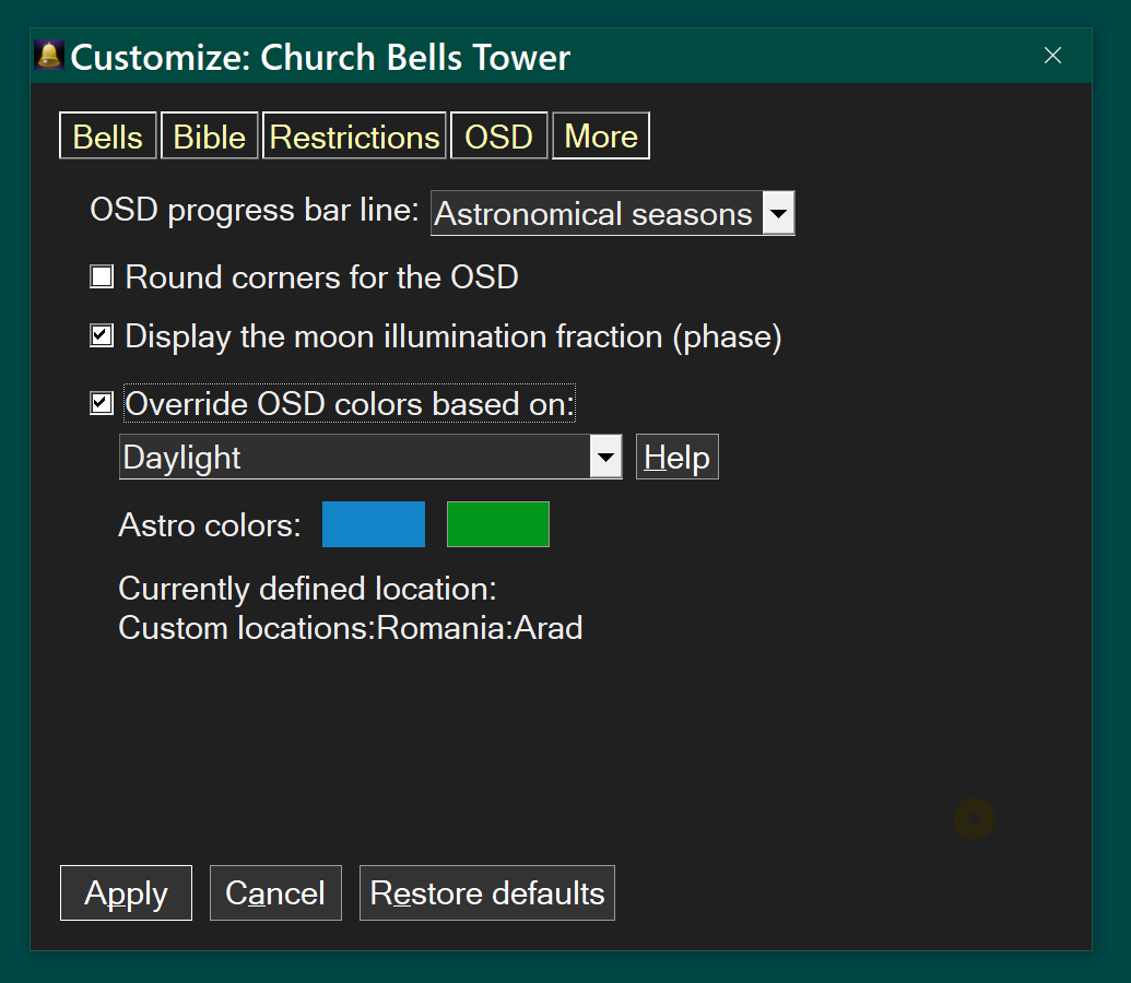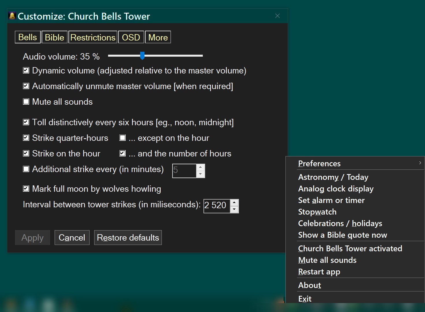 strike quarter-hoursstrike on the hour once... or the number of hourstoll distinctively every 6 hoursoption for tick/tock background soundeasy to configure intervals to chime or to keep silentoption to display on-screen the current time when bells tollastronomy panel: sun and moon rises /sets, graphs, year tables, moon phases, sunlight and moonlight duration, leap years, equinoxes and solsticesoption to additionally strike at a personalized interval, eg., every 5 minutesdisplay random Bible verses in English, German, Russian, Latin, French or Spanish, at specified intervals, eg., every 4 hourssemantron drumming on days of Christian feastsobserve secular, Christian Catholic or Orthodox feasts and holidayscreate a custom list of holidays or celebrationsset an alarm or a timerstopwatch - to help you track activitiesdisplay the time as an analog clockdark mode, large UI fonts