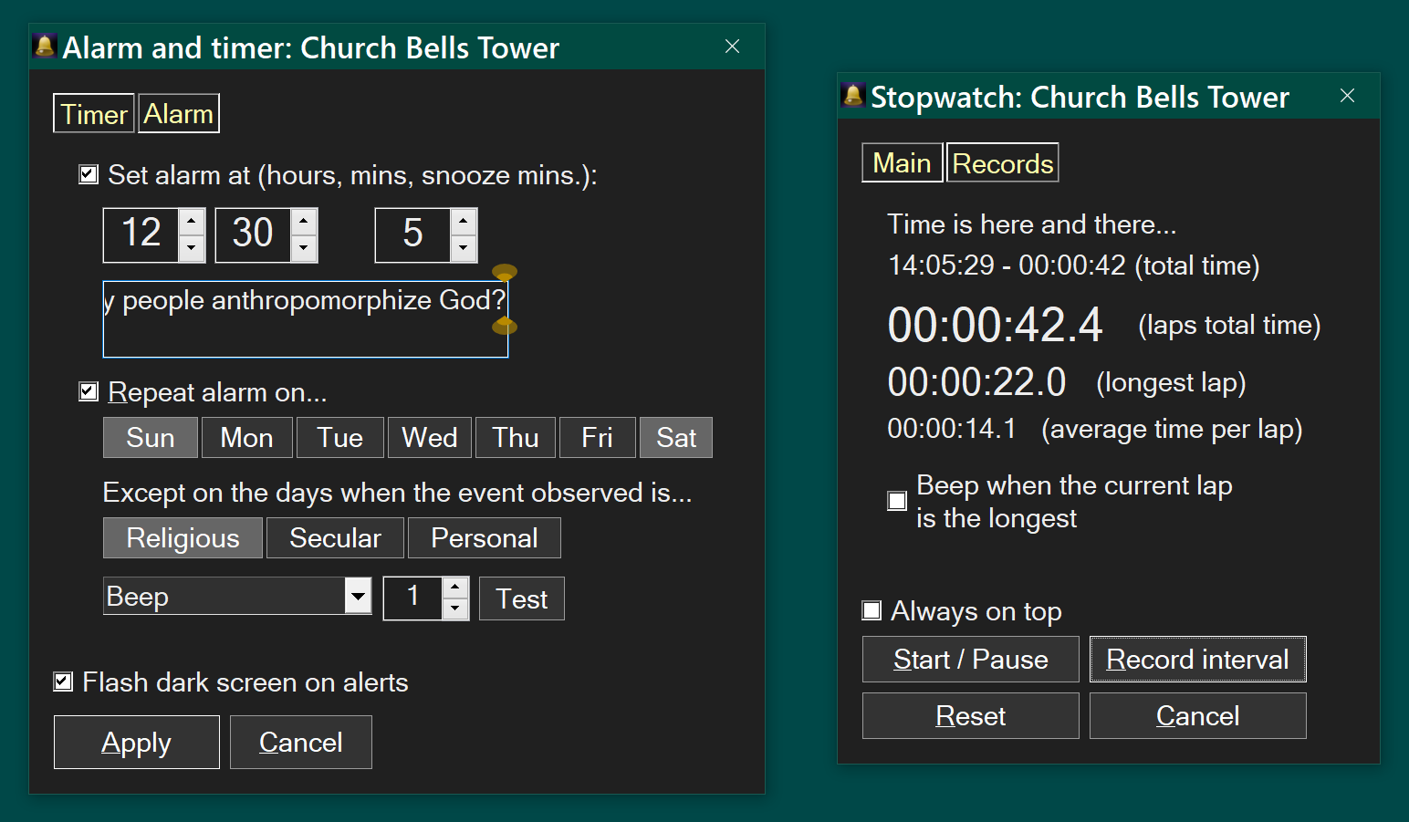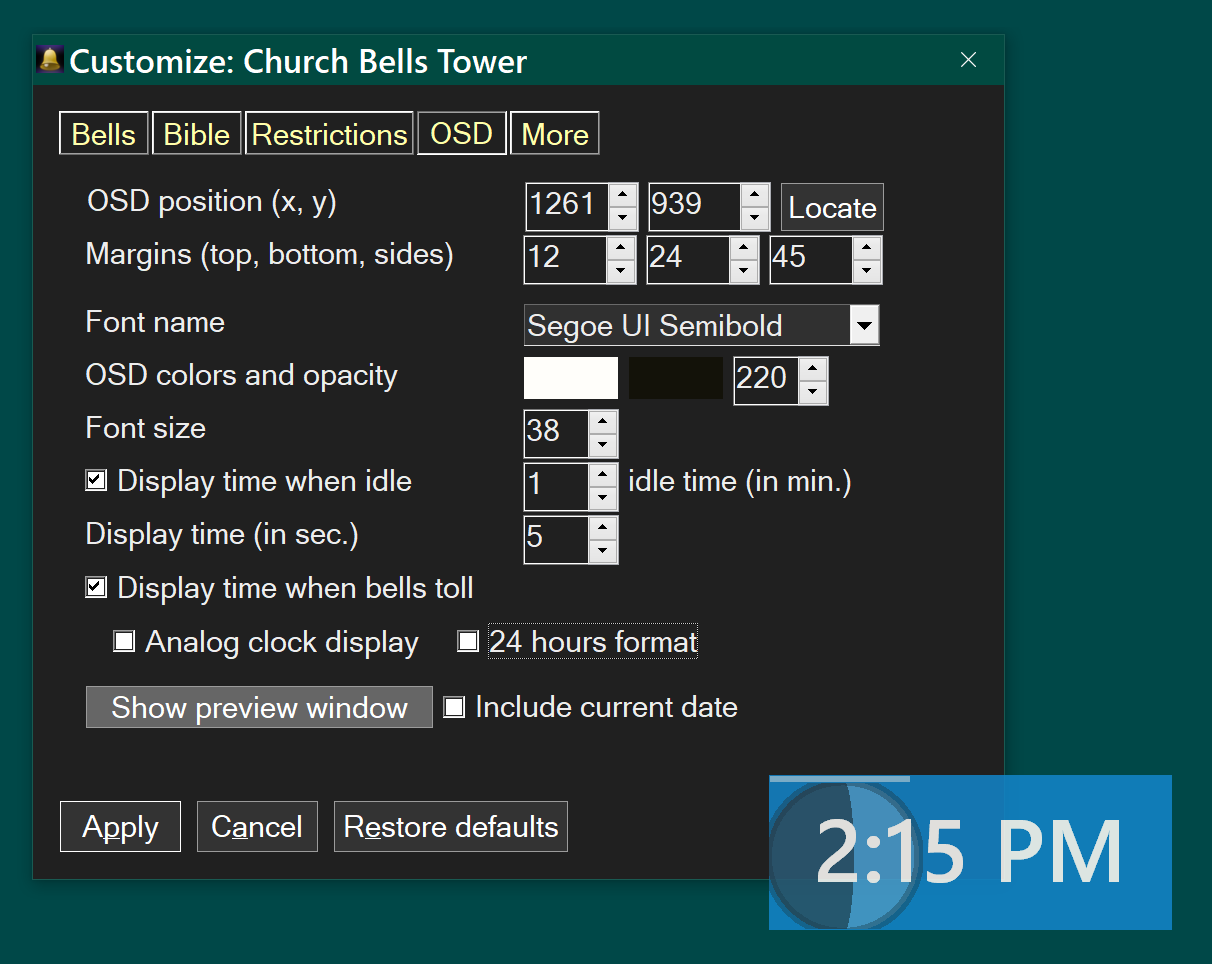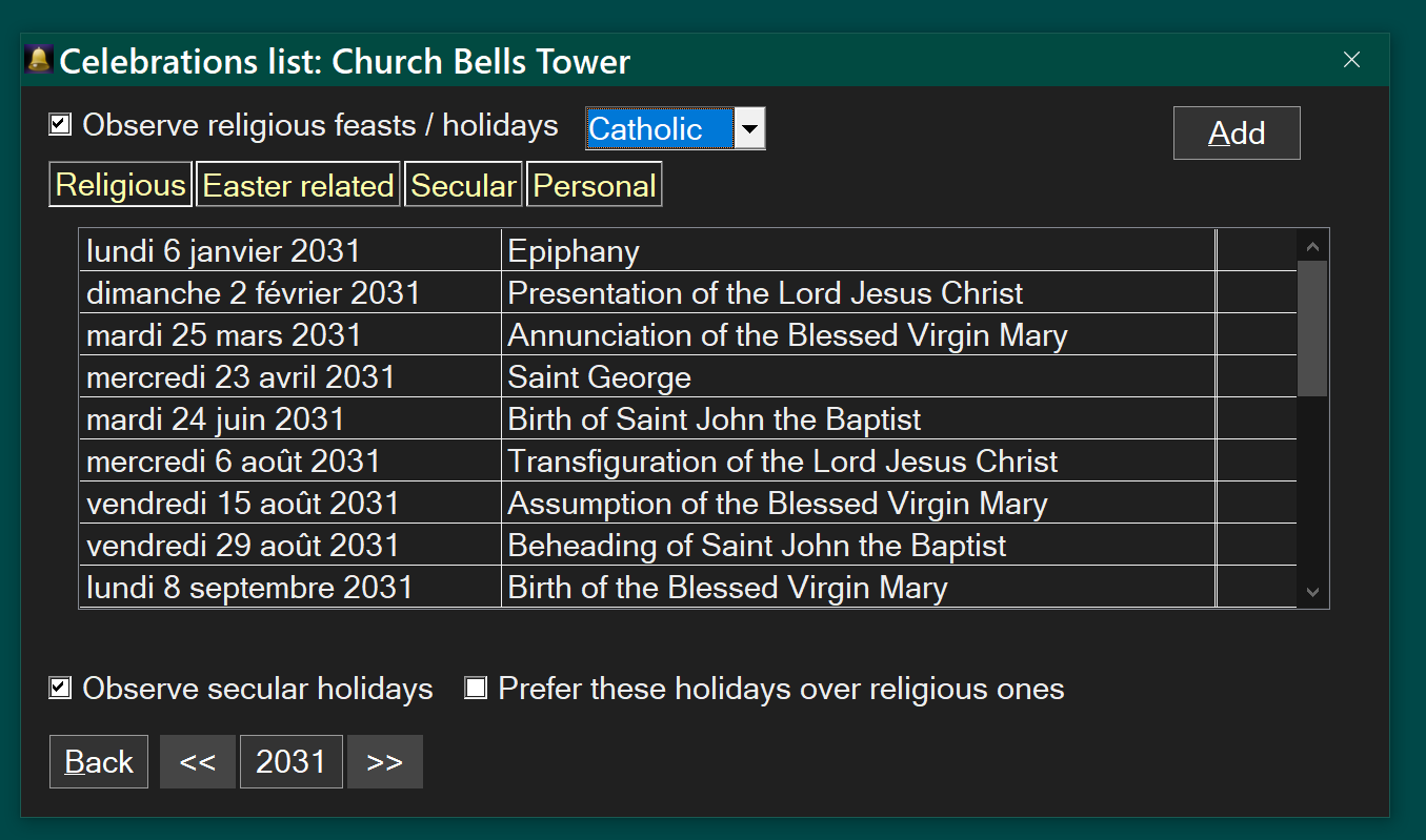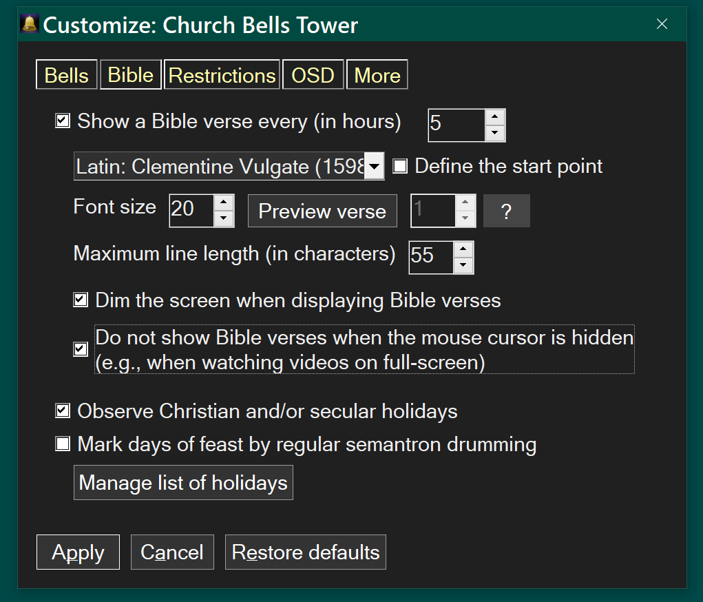 Church Bells Tower can also show Bible quotes daily, at an easy to specify interval. It can remind users of Christian feasts/celebrations or secular international holidays. The days of feast can be marked additionally by regular semantron drumming.