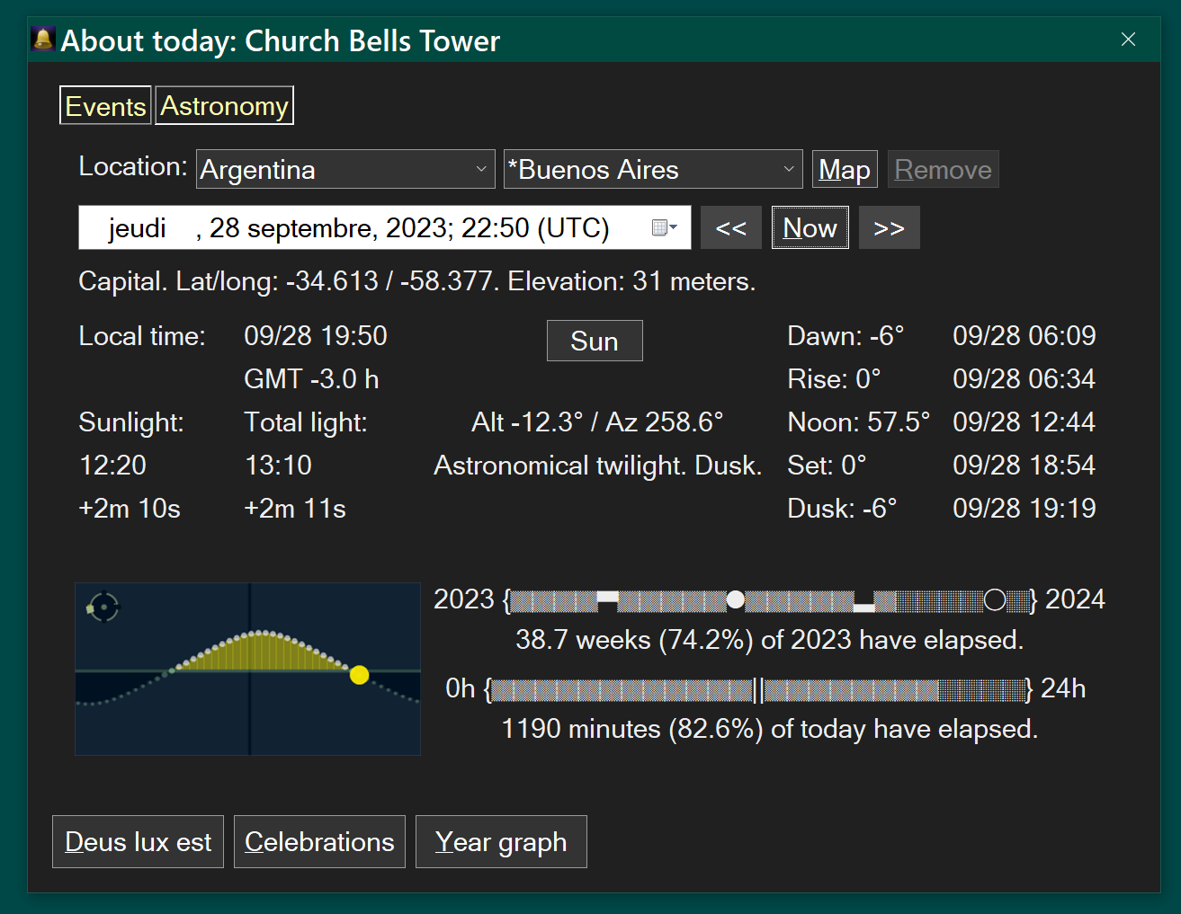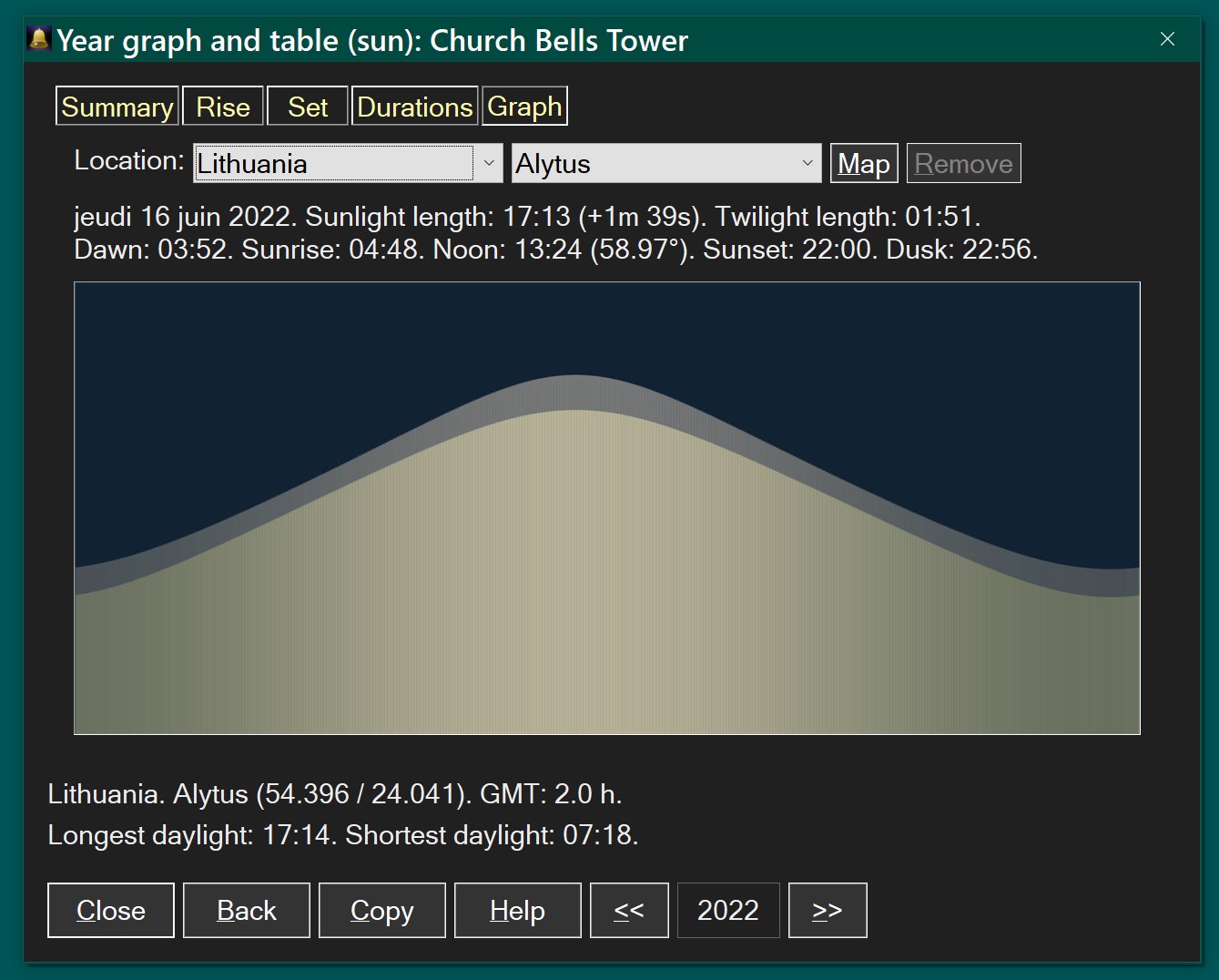 CBT has a dedicated astronomy panel for details about the sun and the moon, when they rise and set. It can show various details, and generate yearly graphs and tables. Up to 55400 locations available and users can define custom locations.