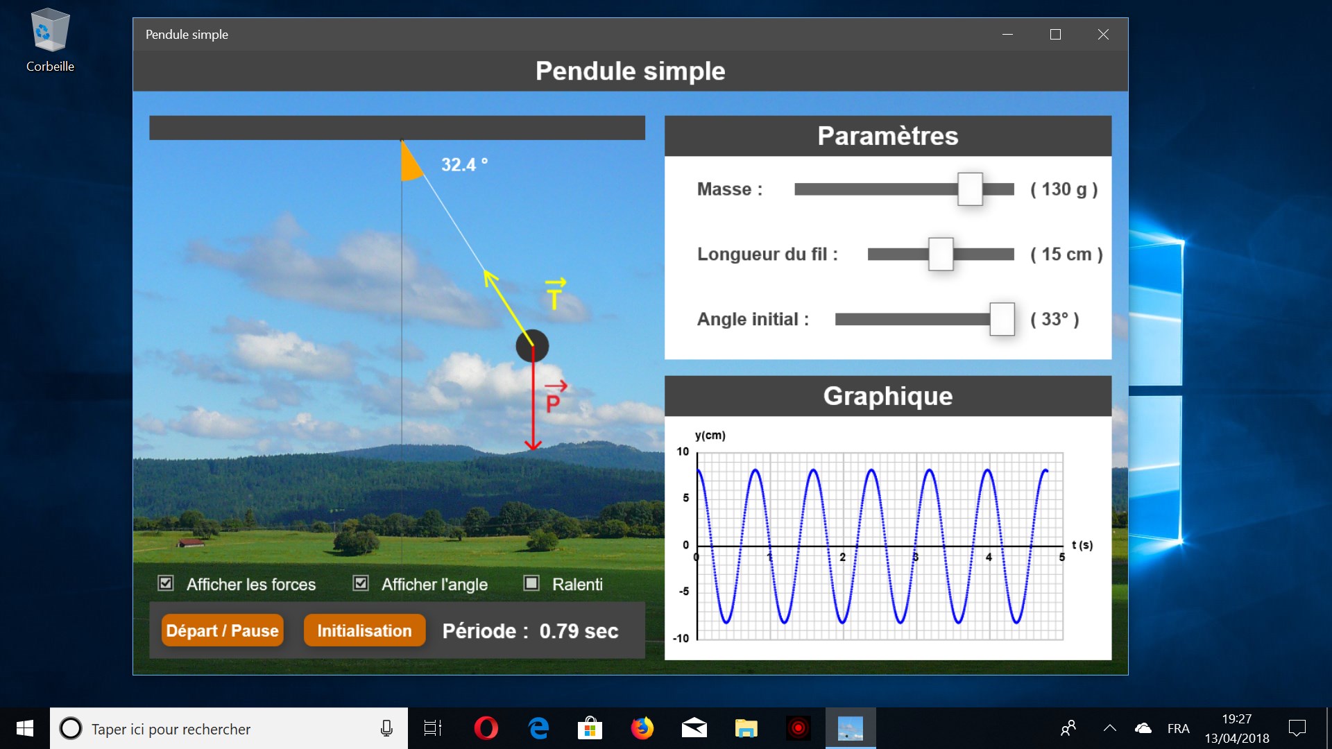 L’application Pendule simple est une petite animation qui permet de voir comment évolue la période d’un pendule simple en fonction de plusieurs paramètres comme la longueur du fil, la masse ou encore l’angle initial de lancement du pendule.