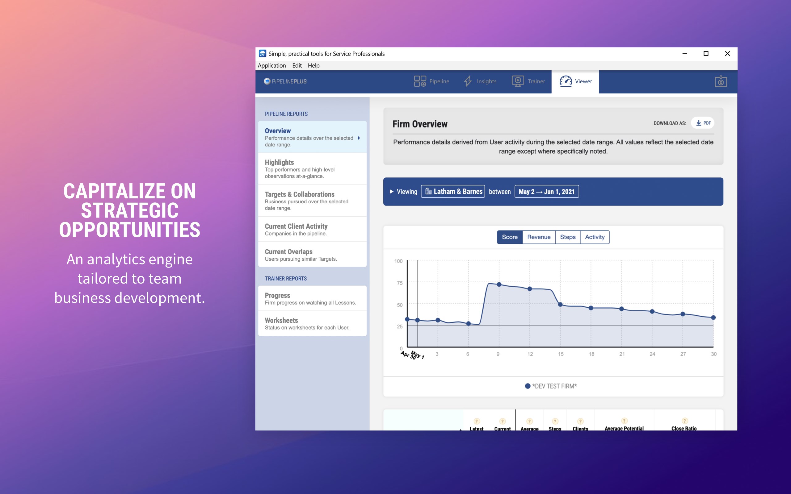 PIPELINE - Our intuitive prioritization system integrates with your CRM and helps you focus on the people you need to contact.TRAINER - Business development e-learning tools to provide the strategies, skills, and mindset business developers need to thrive in today\’s environment.INSIGHTS - Built-in AI provides concrete recommendations, so you know exactly what steps to take to close new business.VIEWER - Comprehensive dashboards that track performance and illuminate new avenues for growth.CUSTOMIZED DASHBOARDS - Fully customized dashboards centralizing and integrating all your marketing, business development, and financial data.Management reports for firm champions to track individual/group business development goals.Free resources to guide users with business development advice (webinars, podcasts, videos, blogs, white-papers, and more)Outlook calendar integration.Email and push notifications to keep you on track of your business development efforts.Collaboration options to share with colleagues to accomplish BD efforts together.Two-factor authentication.Revenue tracking and analysis.