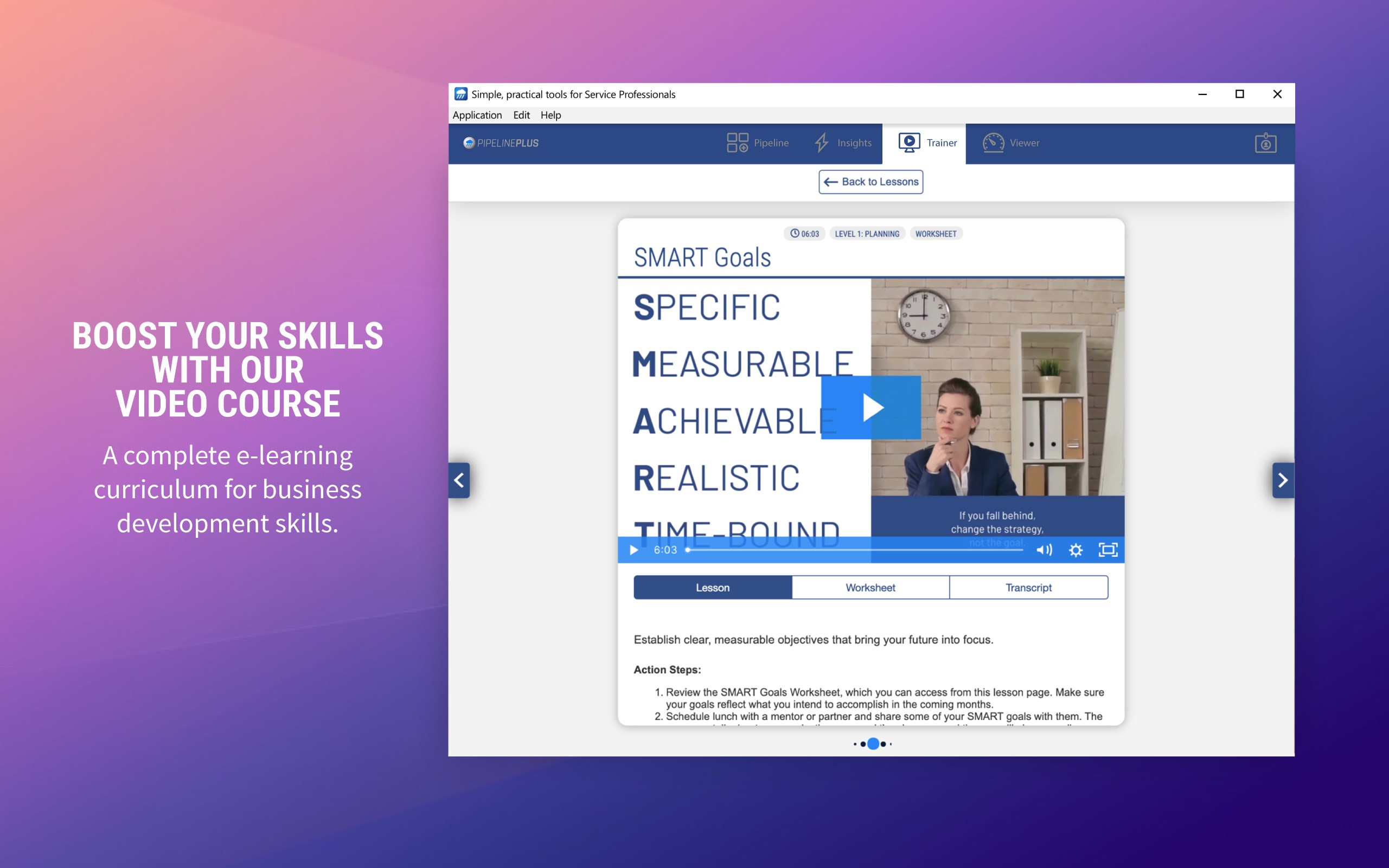 4. TRAINER. Our e-learning curriculum of videos, worksheets, and action steps delivers tried-and-true techniques that every business developer needs to succeed.