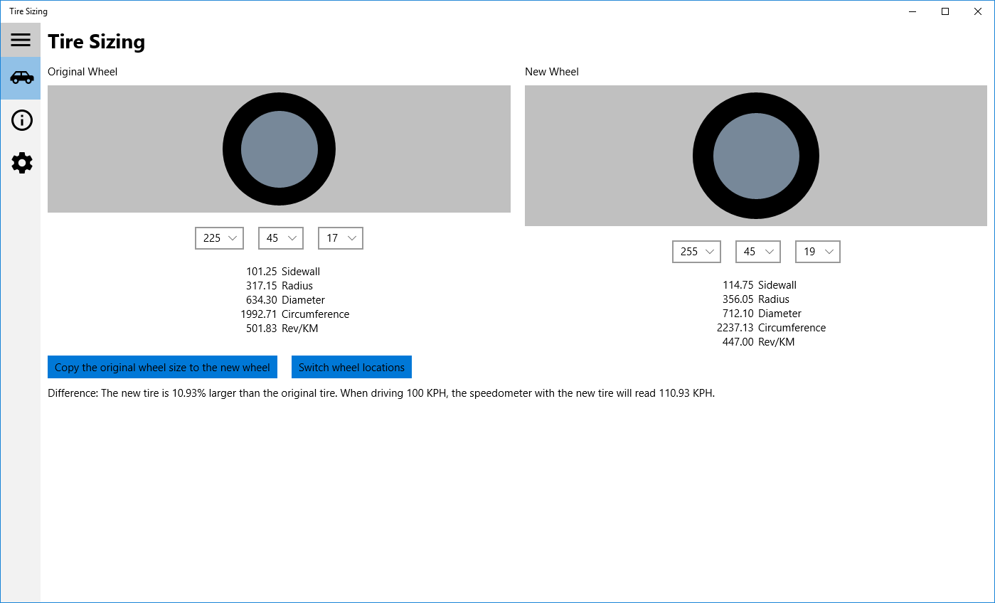Use this app to determine if the new rims and tires will affect your speedometer reading, and choose the best size that has the smallest impact.
