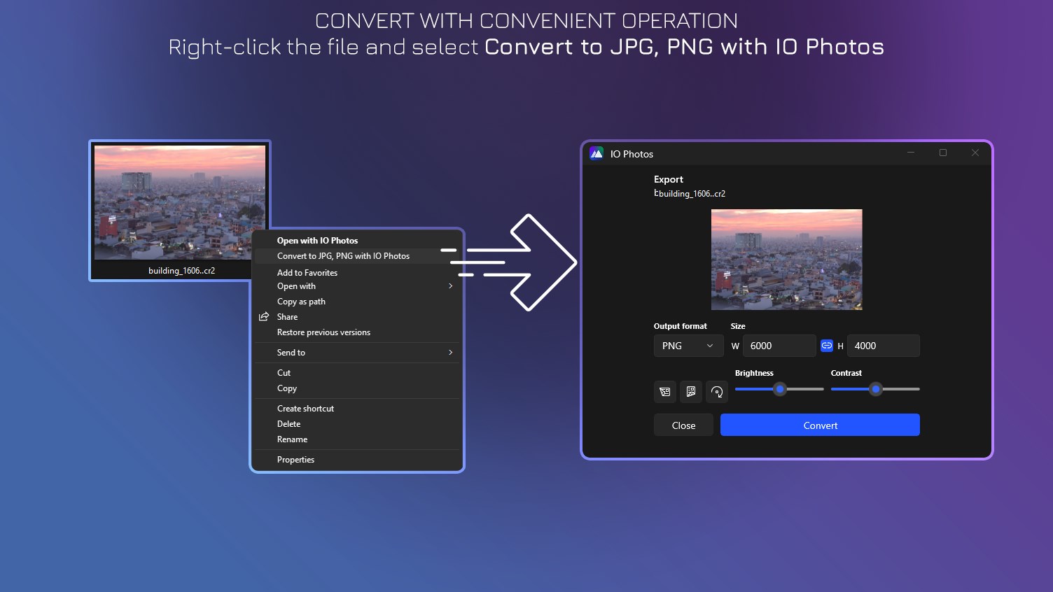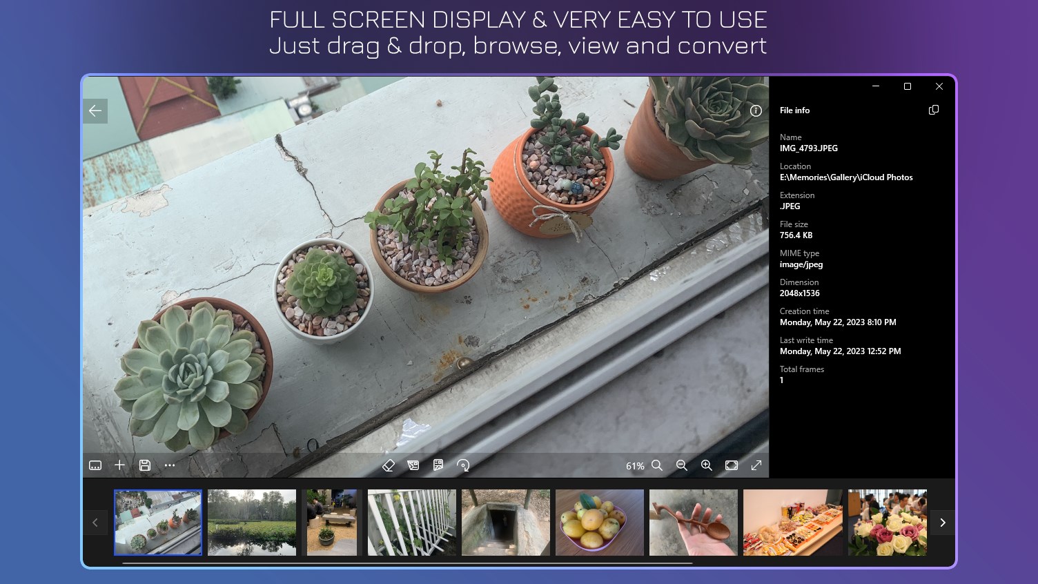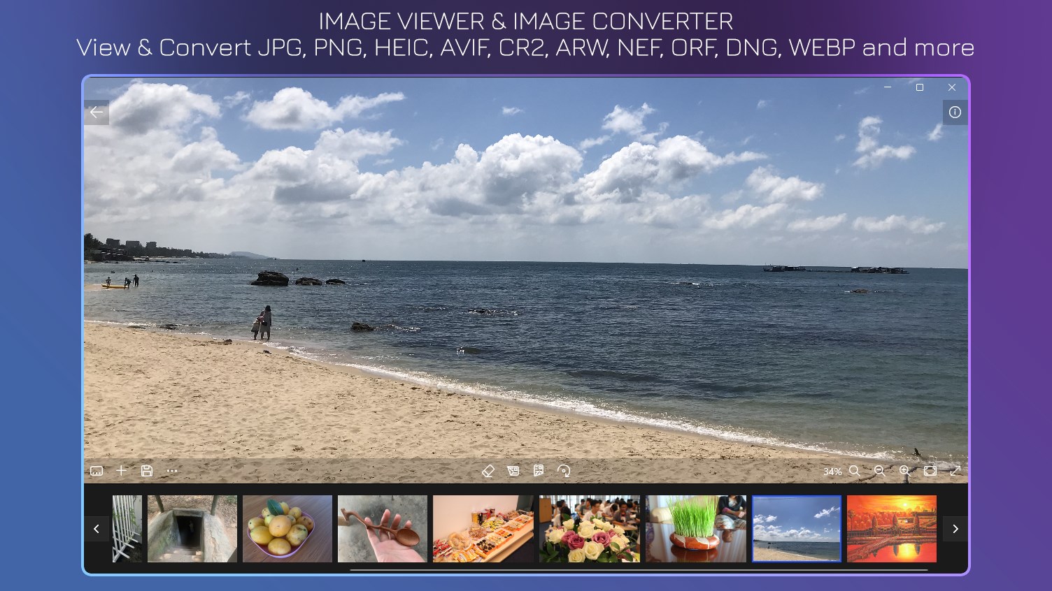 View and Convert many image formats and Raw camera formats: HEIC, AVIF, JPG, PNG, TIFF, CR2, NEF, ARW, DCR, DNG, HEIC, WEBP, PSD, …