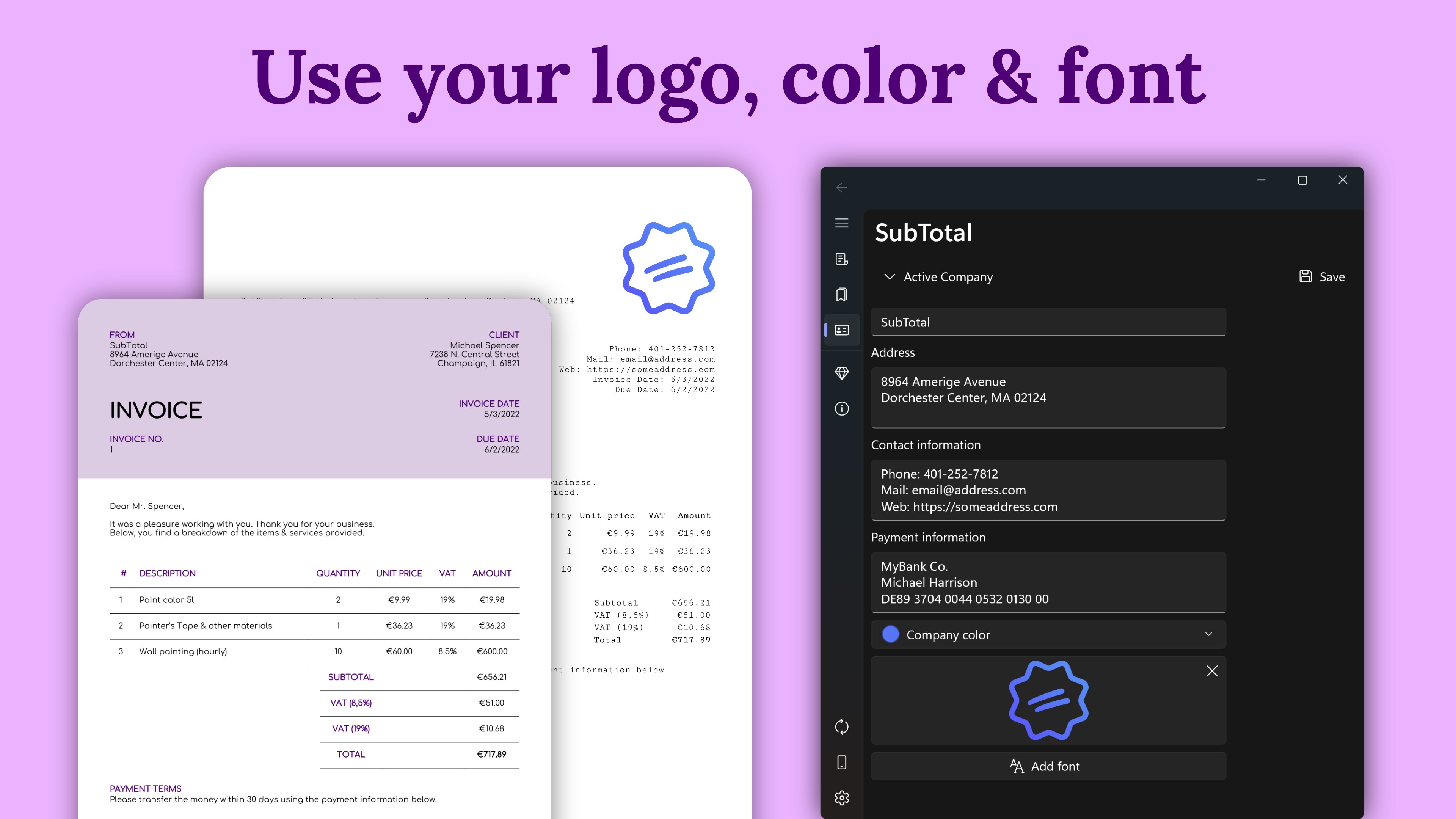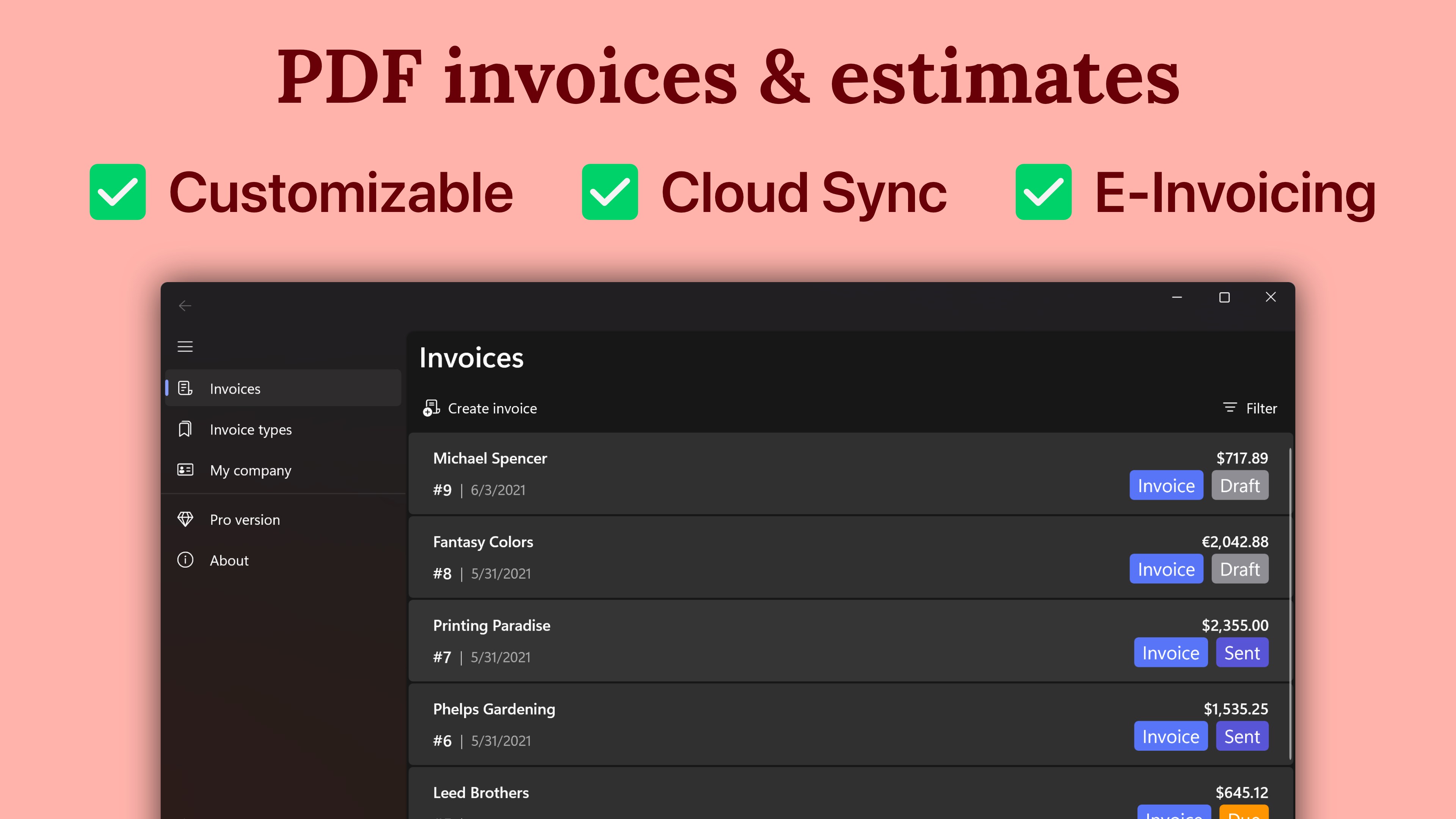PDF invoices, estimates & offersCross platform with Cloud SyncCreate invoices from WorkingHoursInvoice managementPDF invoice templatesUse your own logo, color & font