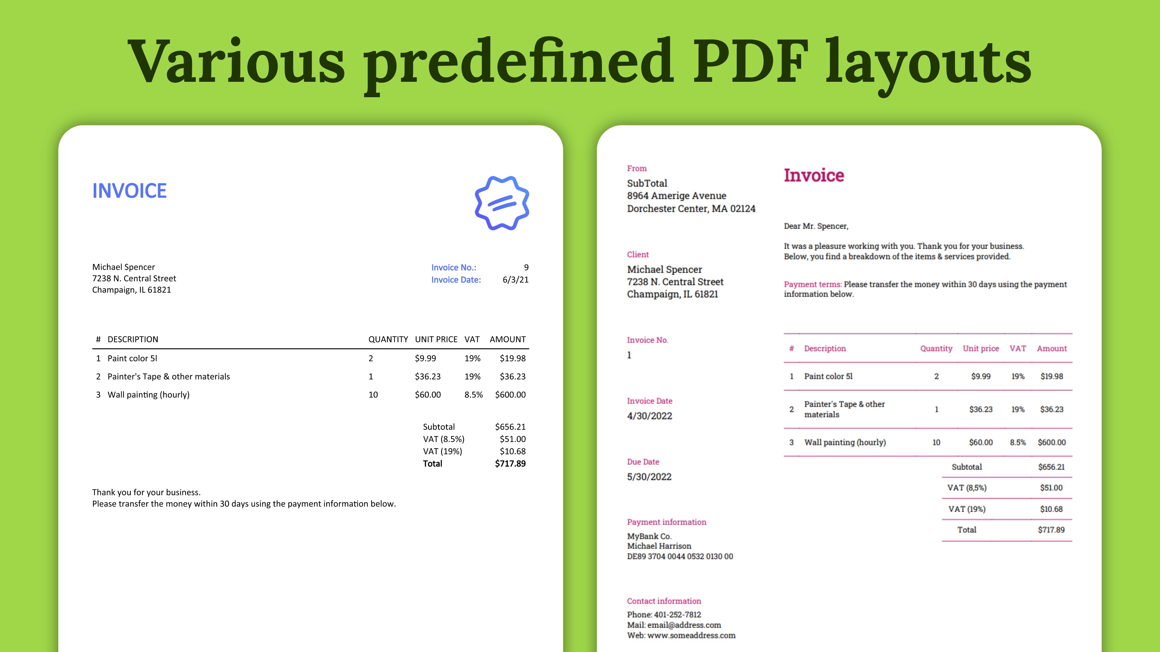 • Quickly create PDF invoice, quote or estimate & send them to your clients