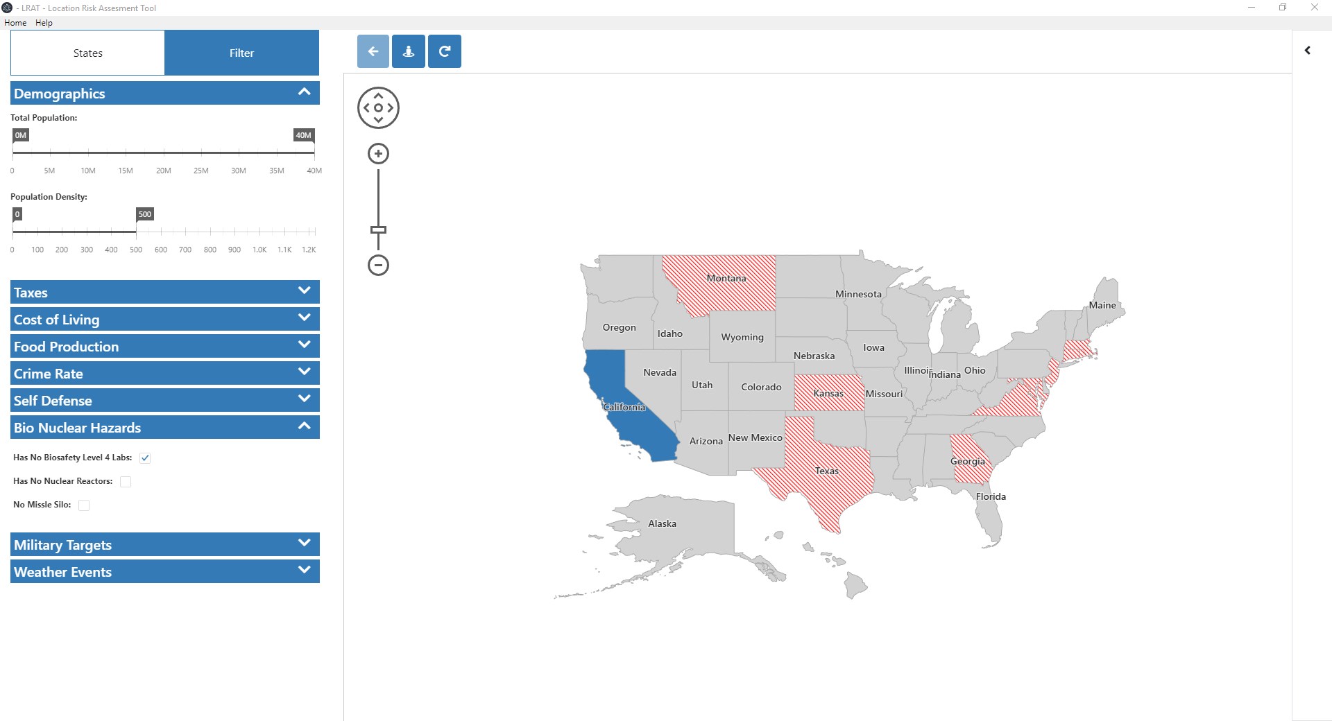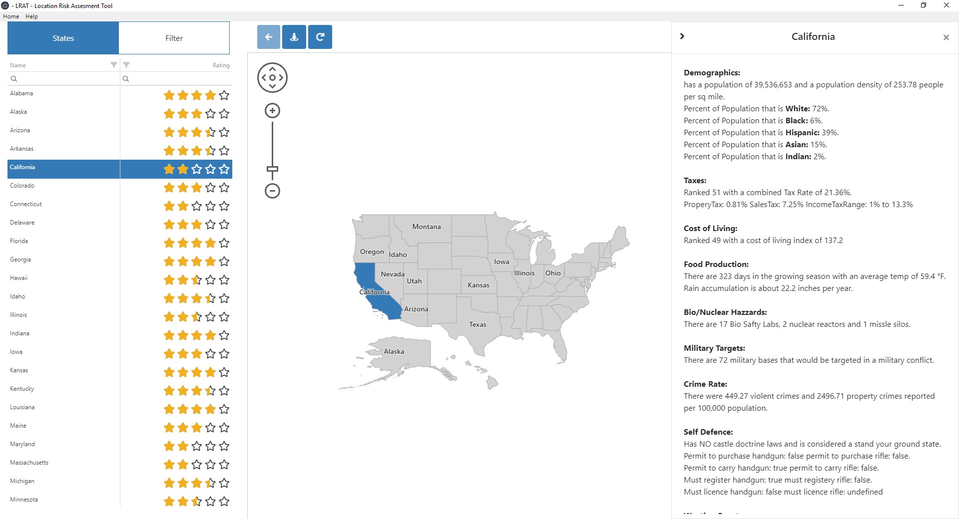Provides Demographics,Taxes,Cost of Living,Food Production,Bio/Nuclear Hazard,Military Targets,Crime Rate,Self Defense,Weather Events data on US StatesProvides Demographics, Bio Nuclear Hazard and Military Target information at a county level Filter states based on multiple categorizes and criteriaFilter counties based on multiple categorizes and criteriaState MapsCounty Maps