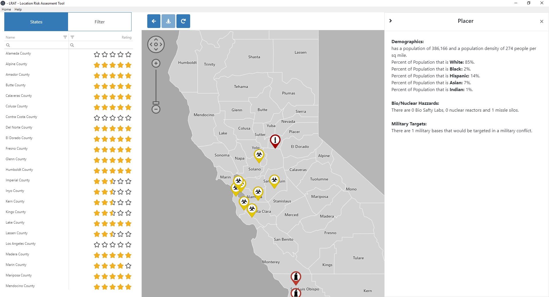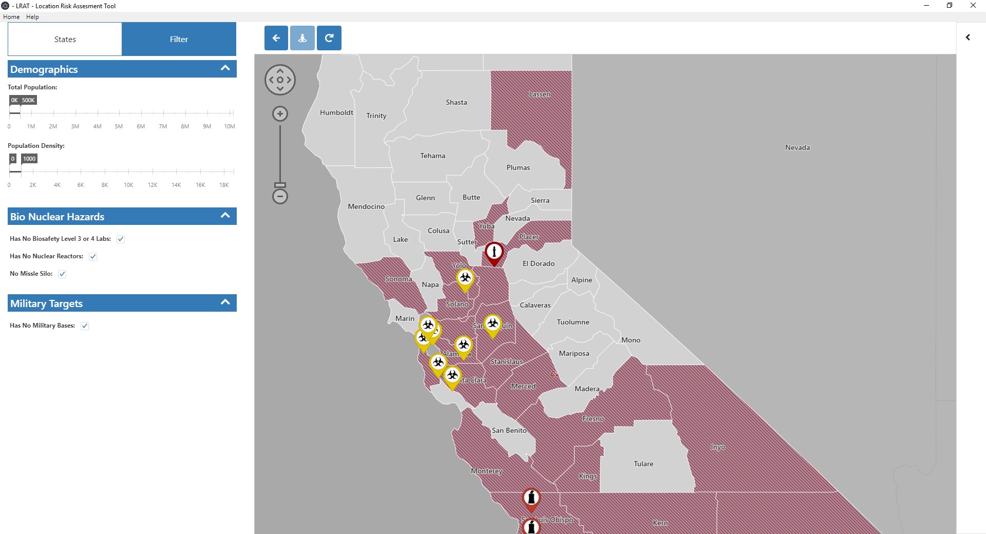 LRAT also provides a county detail view of each state by allowing you to zoom in and view the counties of each state. We identify potential threats such as nuclear reactors and BS4 Labs. In the County view you can also filter counties on multiple criteria to rule out any counties that do not meet your needs.