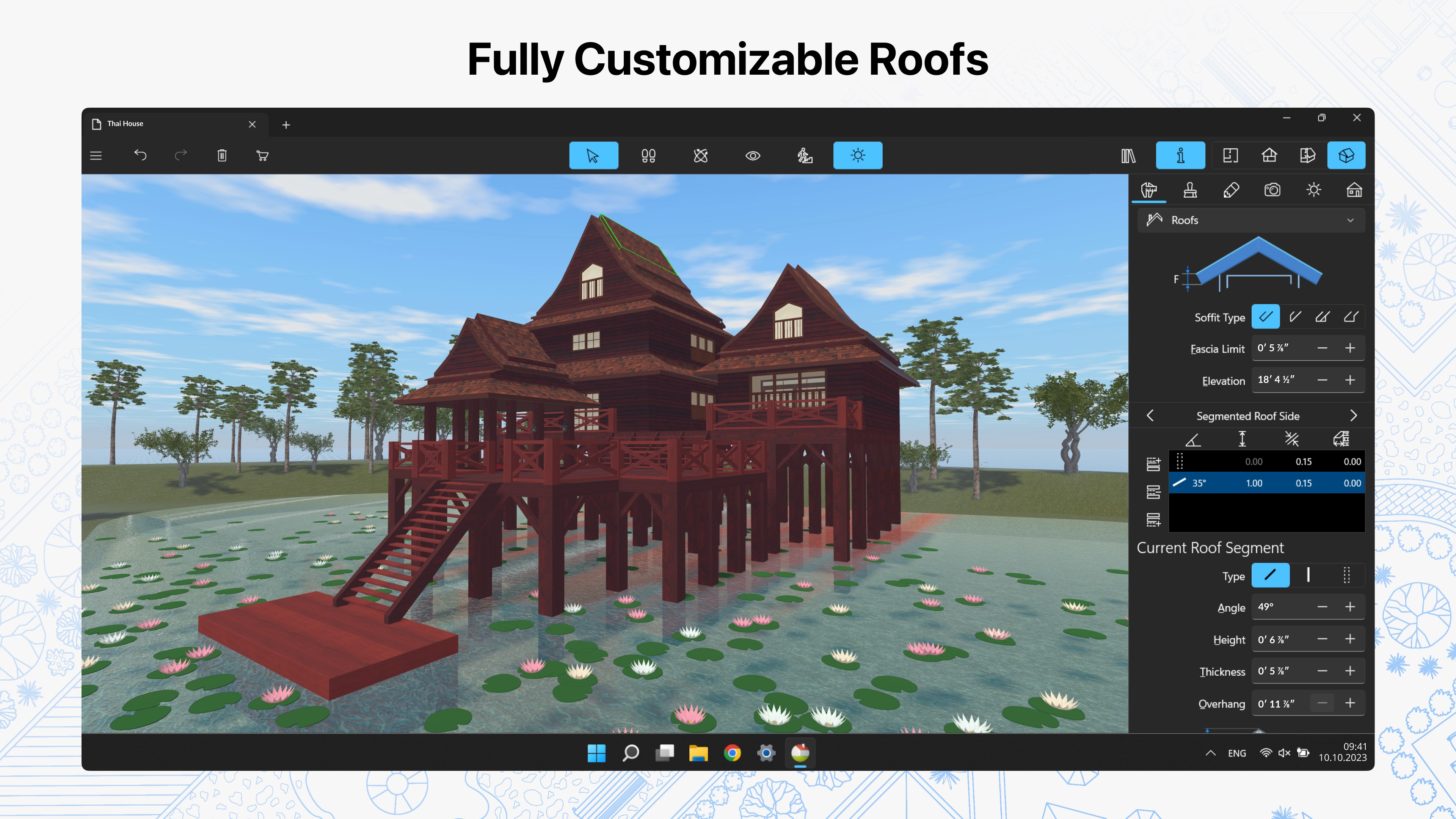 • Work with the customizable roof, create corner windows and complex openings;