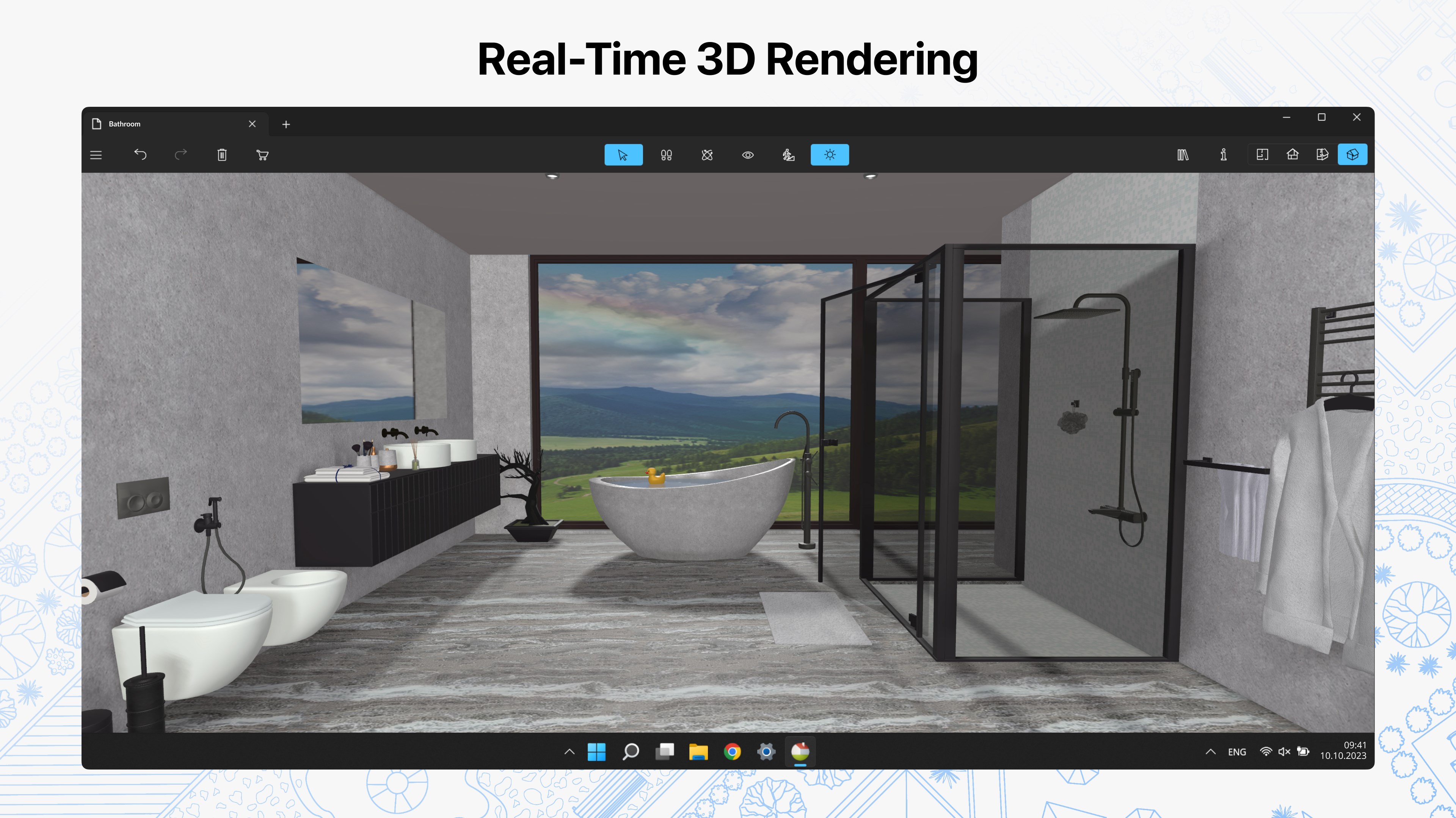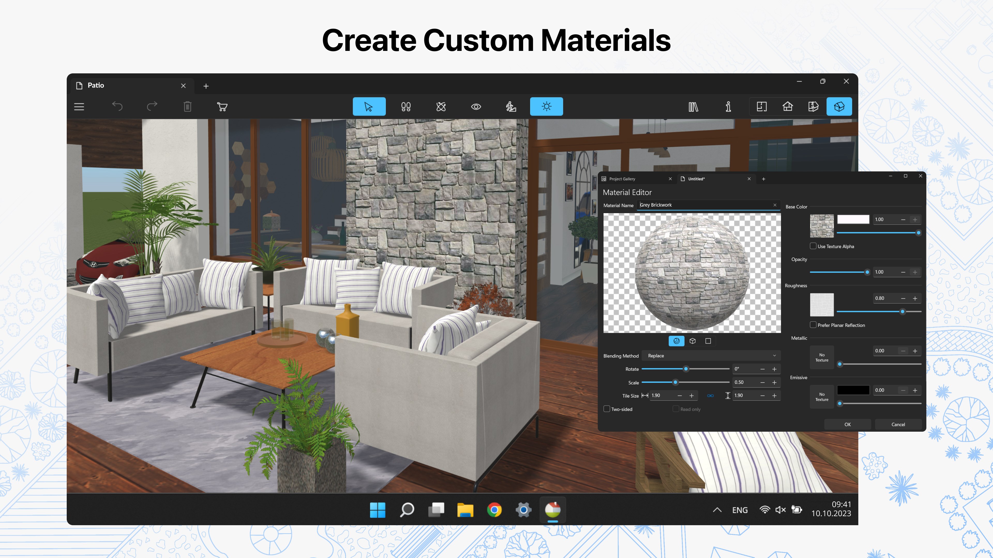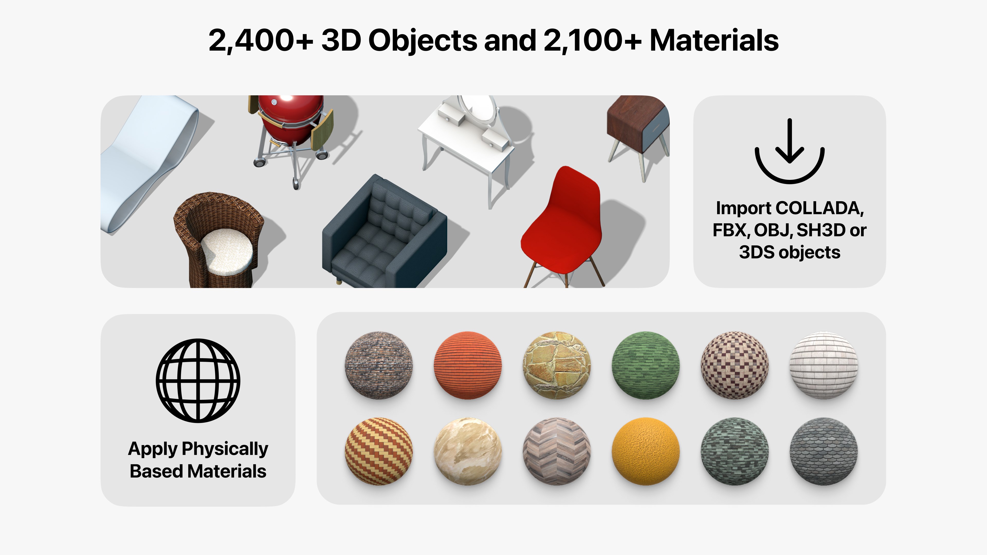 • Add and move furniture and other objects (2,400+ items), and apply physically based materials (2,100+ supplied materials);