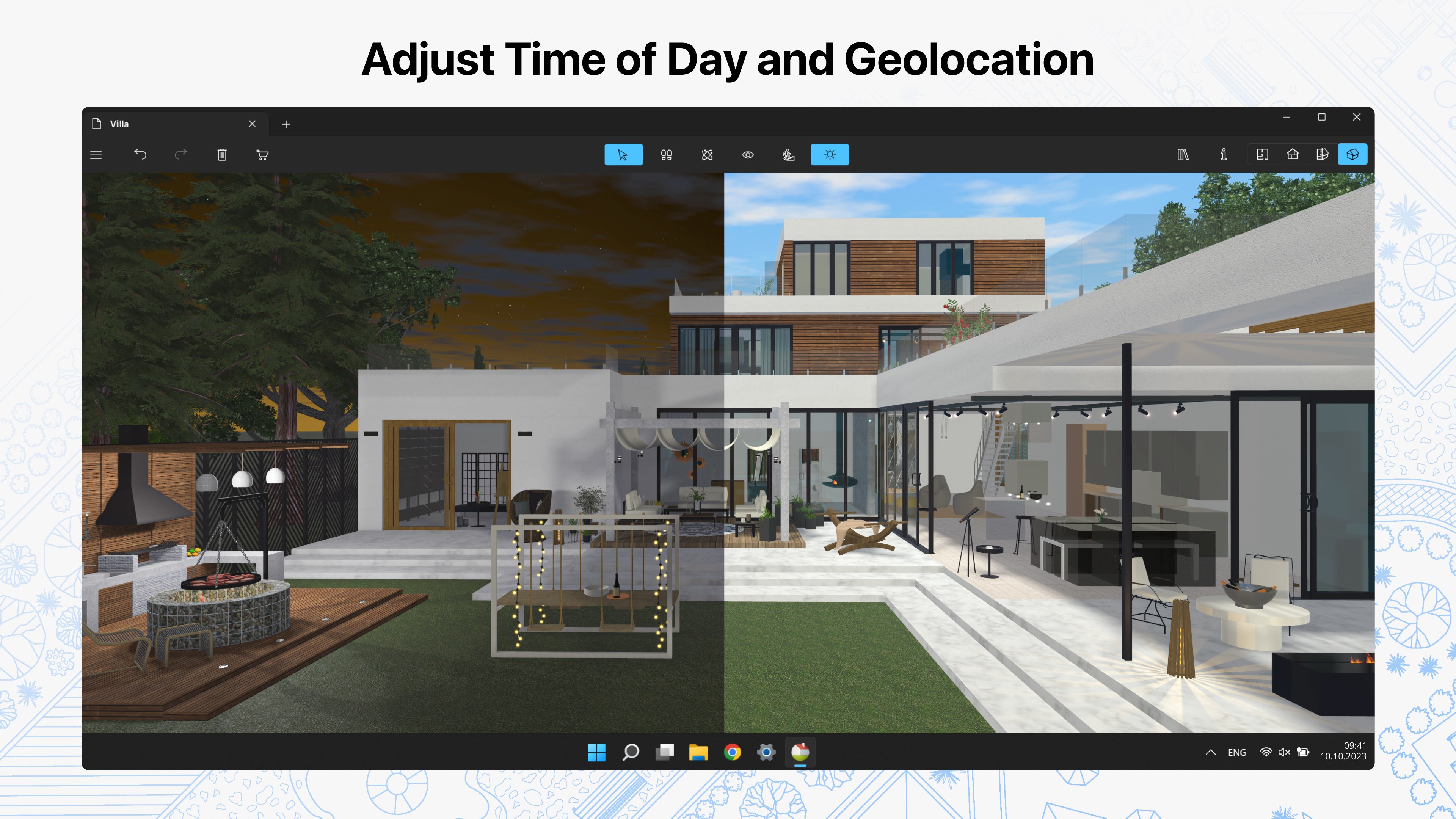 • Achieve natural lighting by setting up true geolocation, time of day and cloudiness;