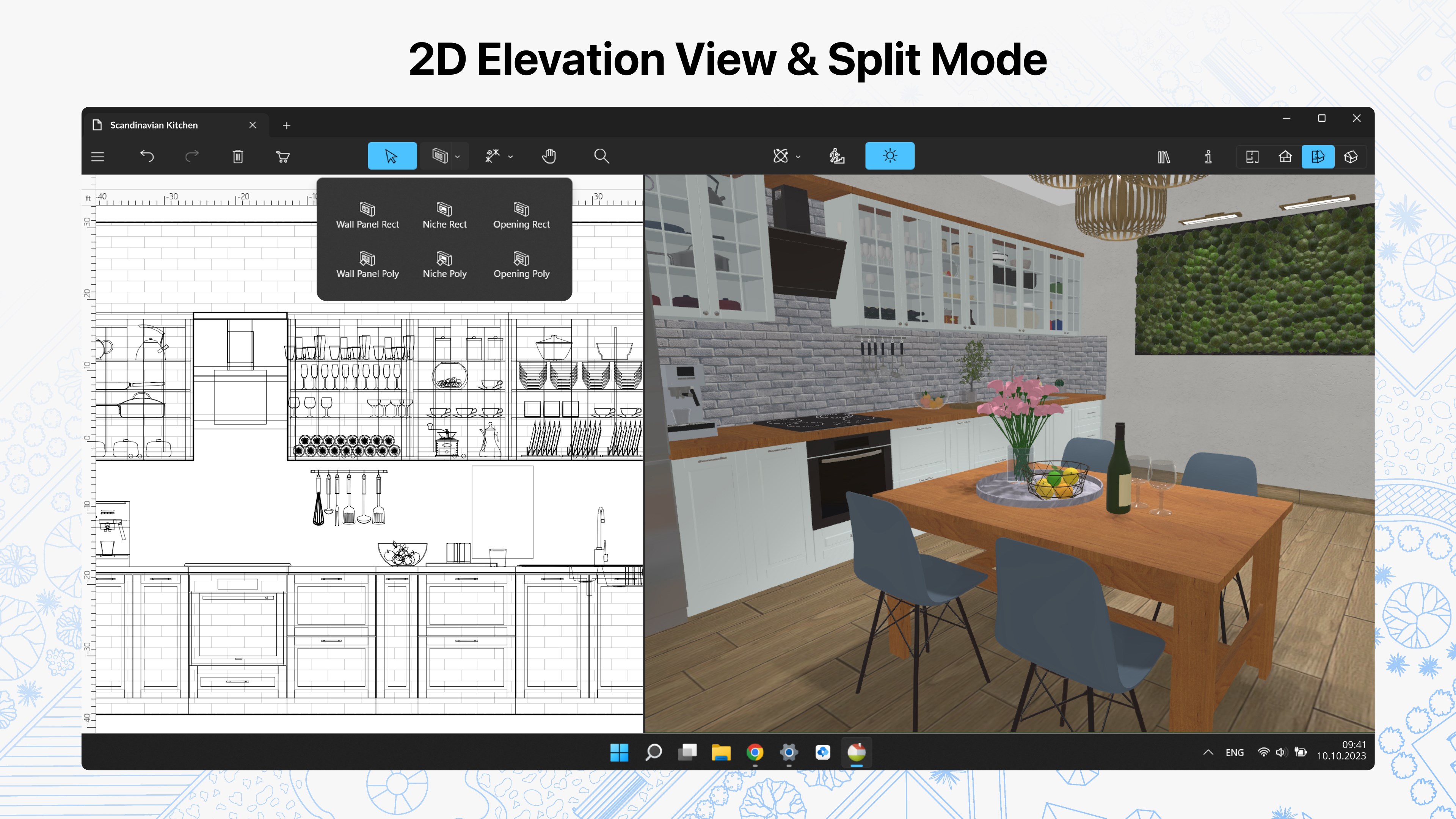 • Work in 2D Elevation view that displays the side view on walls and roof, a perfect tool for working with openings, niches and wall panels;*