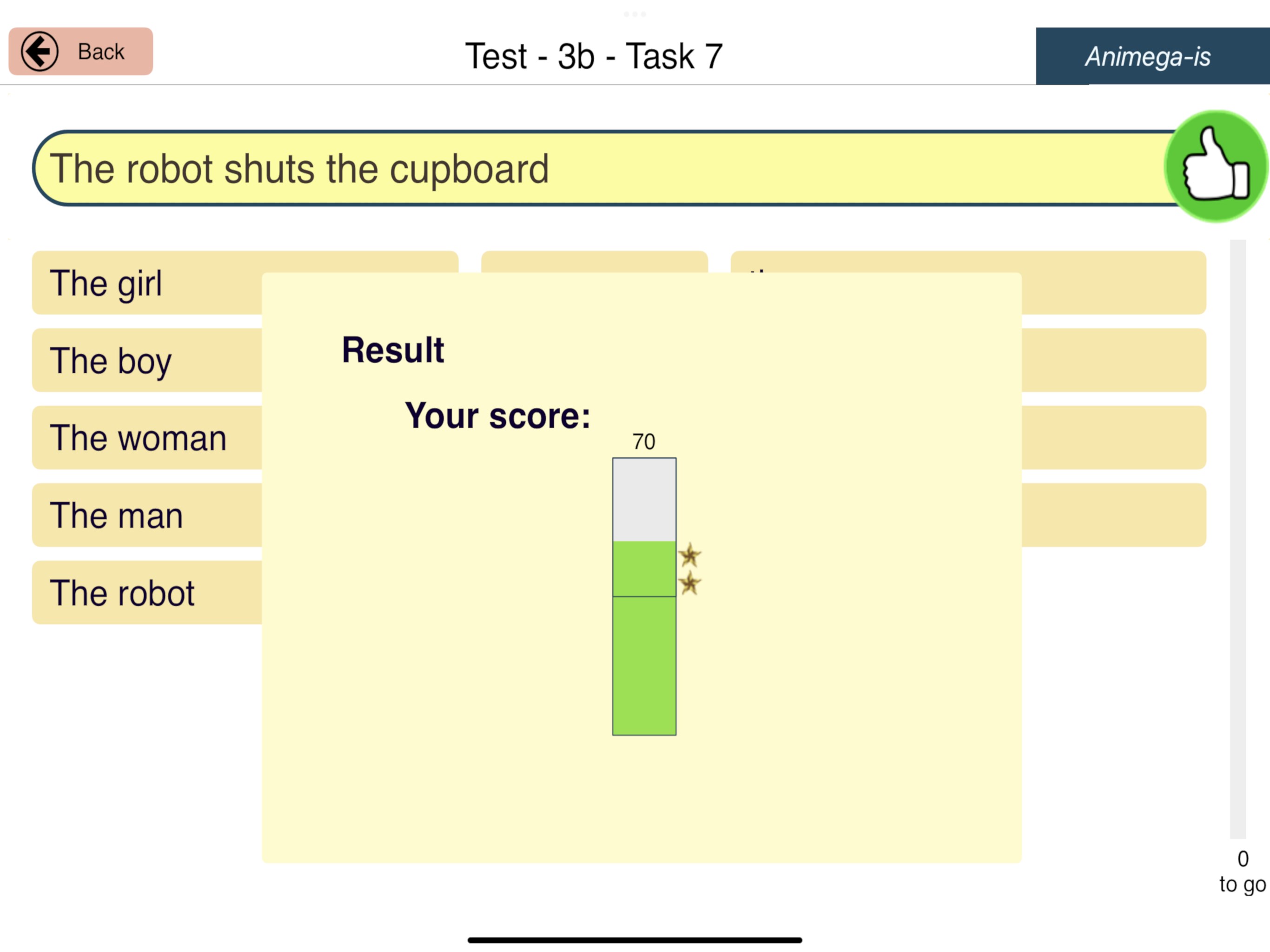 Animega-is consists of a total of 57 tasks (exercises) distributed over six levels. The rich material (> 250 words/phrases and > 4400 sentences) can be accessed through two different routes: Create and Test. In short, the learner can either generate interesting animated events by using text buttons to create sentences, or test his or her proficiency by first viewing the event, then choosing words to create the sentence that best represents what he or she has just viewed.