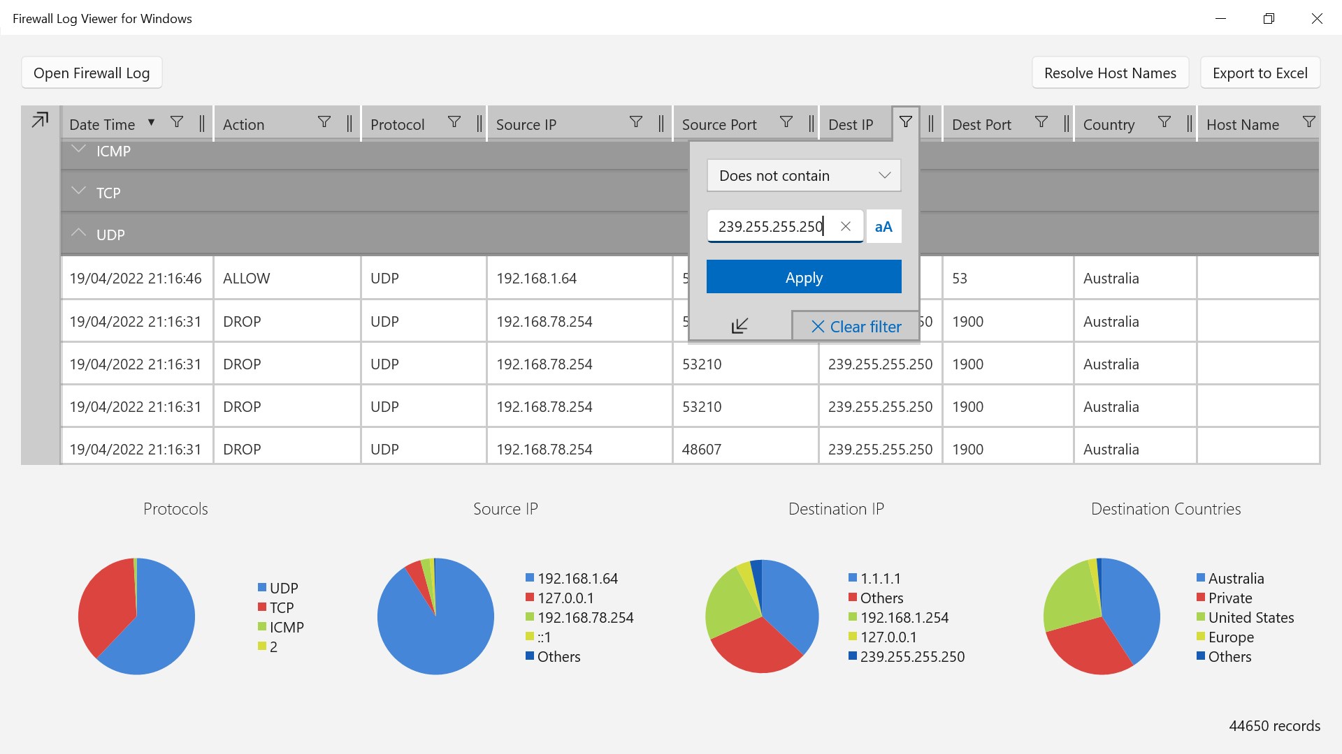Windows Defender Firewall Logs ViewerIP GeolocalizationReverse IP LookupCustomizable Filtering, Grouping and SortingPie ChartsData ExportBlacklist