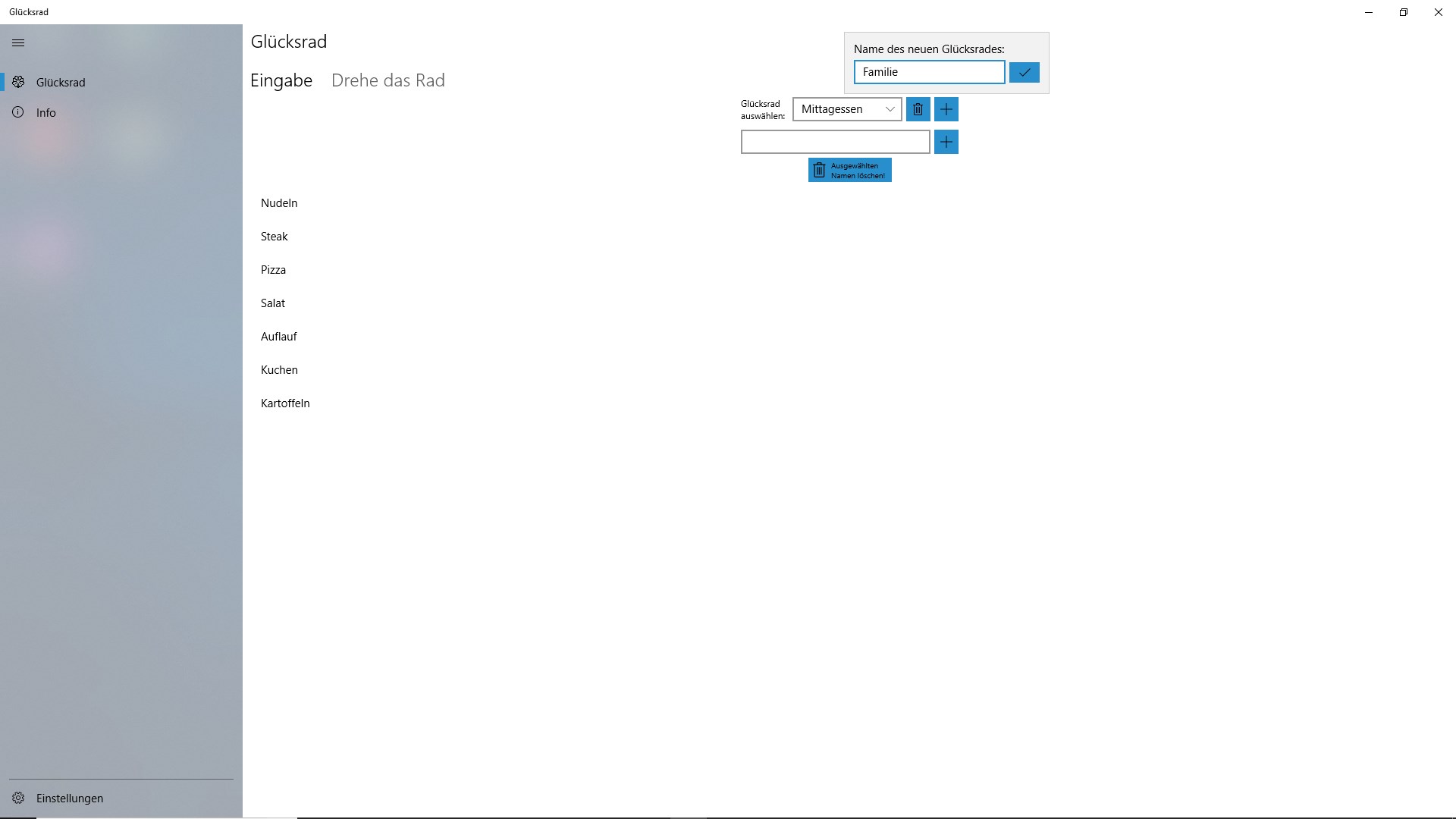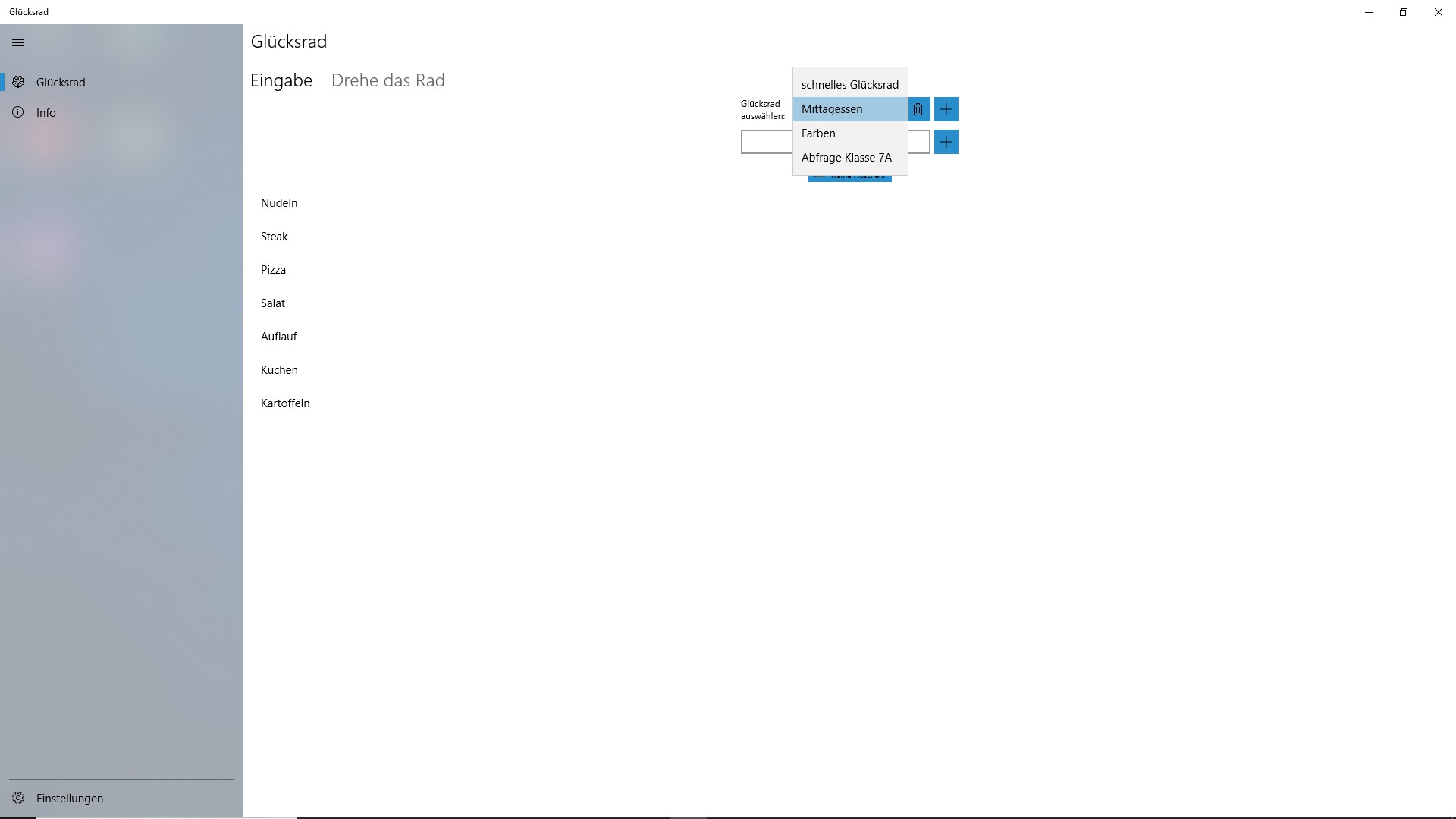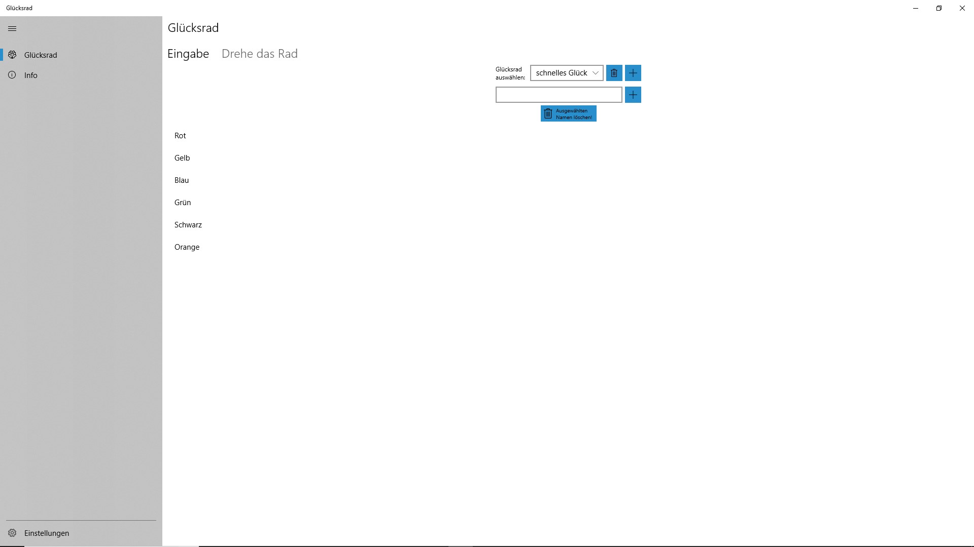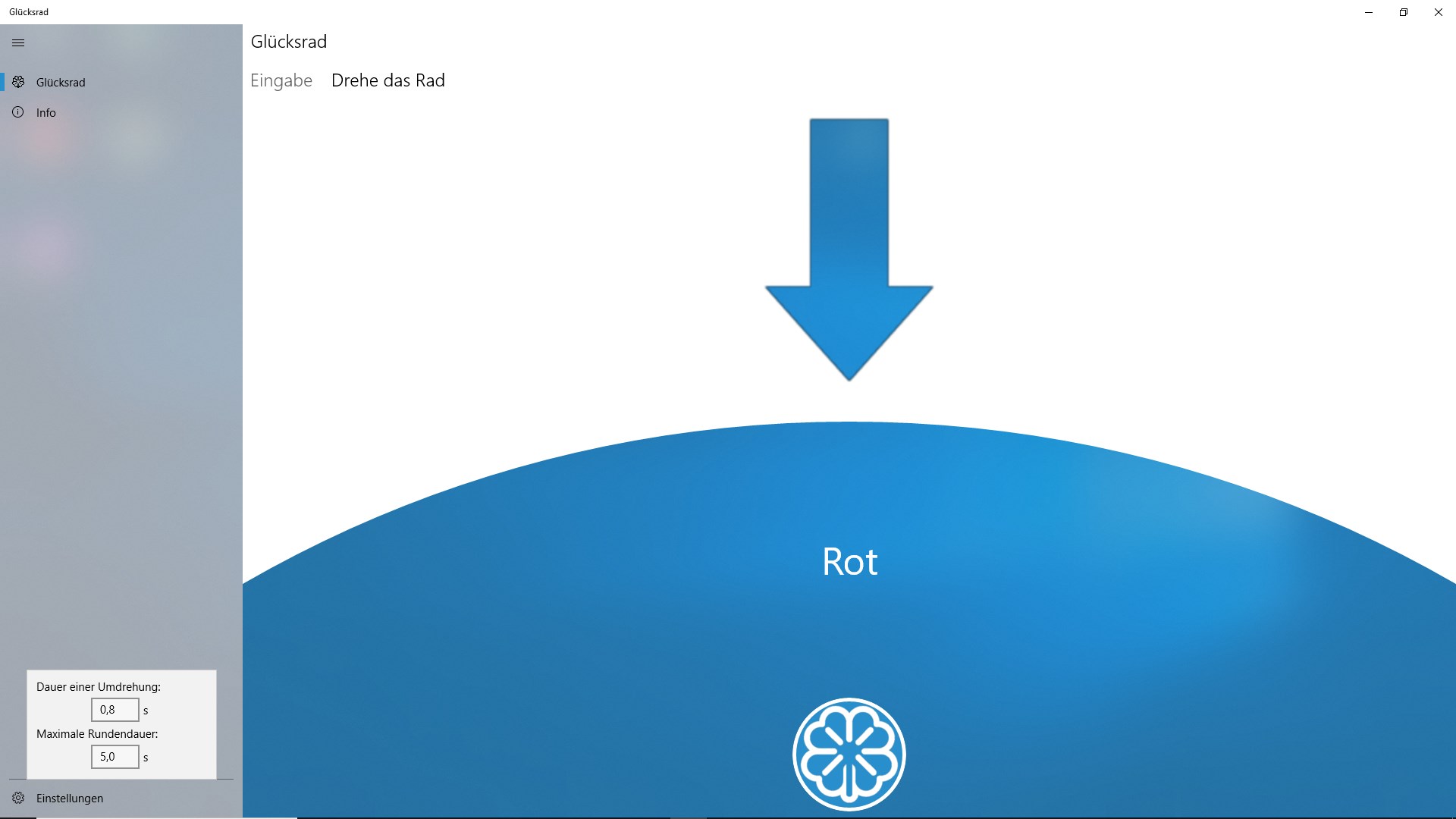 Mit dieser App lassen sich ganz einfach Glücksräder generieren um zufällig eines von Ihnen bestimmten Wörtern auszuwählen. Des weiteren lässt sich die Dauer einer Umdrehung und die maximale Dauer einer Runde festlegen um sicher zu stellen, dass auch bei sehr großen Glücksrädern eine schnelle Auswahl gewährleistet wird.
