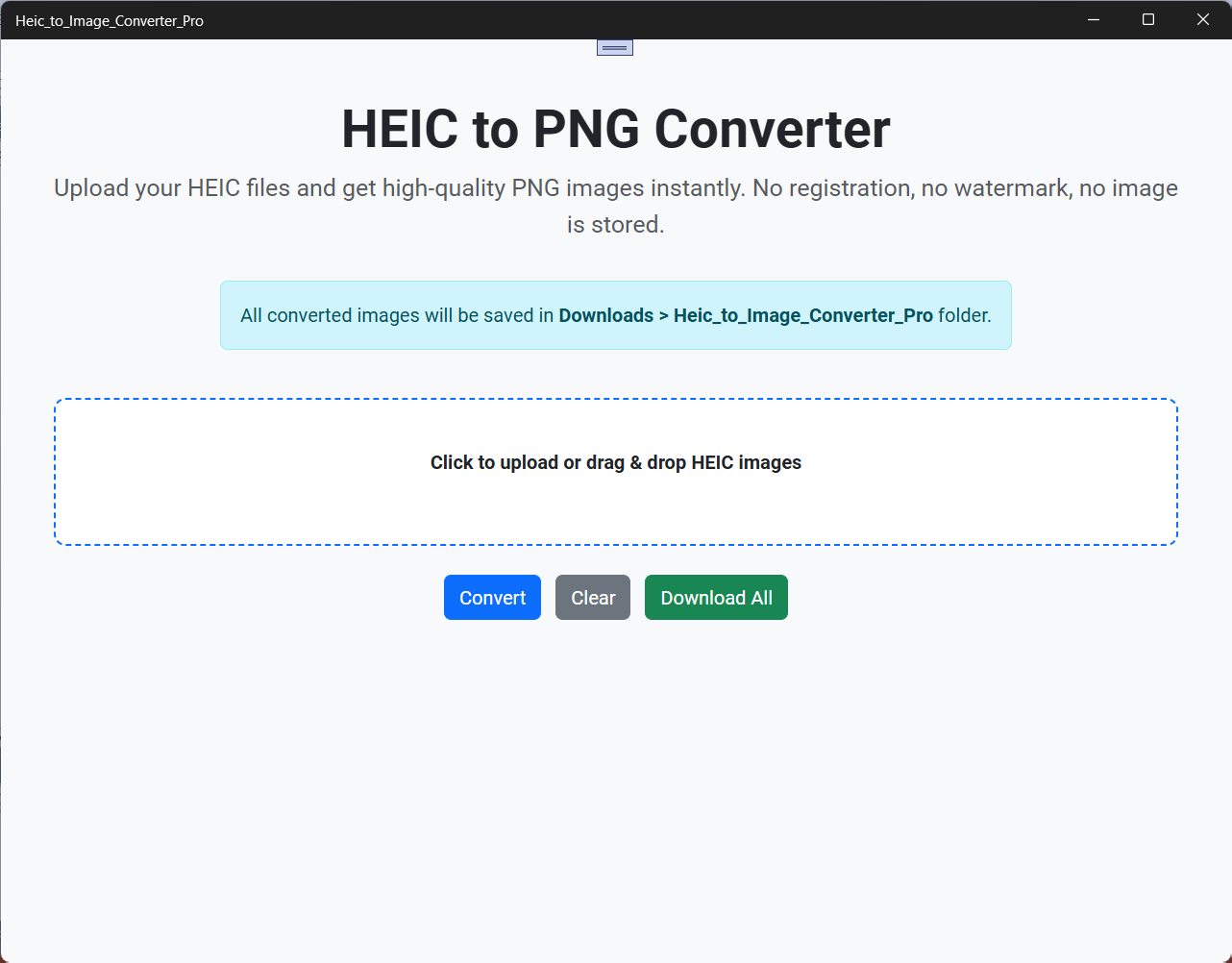 U+1F504 HEIC to PNG Conversion: Converts .heic files to .png with high-quality output.U+1F4E5 Batch Conversion: Select multiple HEIC files and convert them all at once.U+1F4E6 Download All as ZIP: Easily download all converted images in a single ZIP file.U+1F4C2 Saved to Downloads FolderU+1F512 100% Privacy: No image is uploaded or stored online — everything happens offline.U+1F9FC No Watermarks, No Limits: Use freely without restrictions or annoying watermarks.