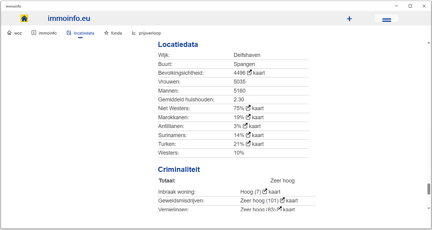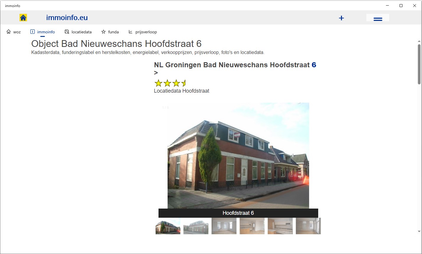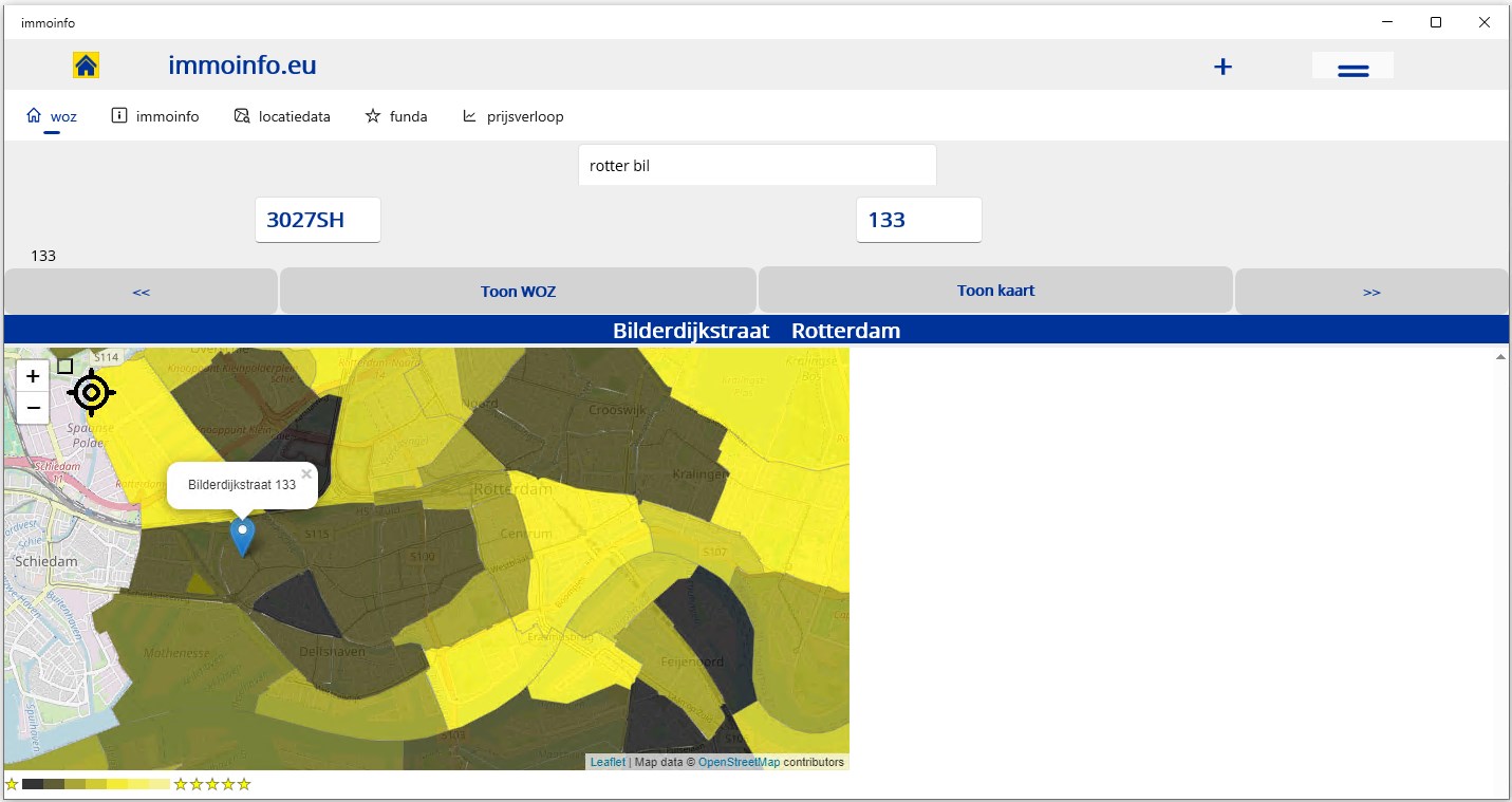 Direct de woz waarde en immoinfo van de woningen op locatie. Zoek op de kaart, op adres of postcode. Bekijk het aantal sterren van de buurt, foto\'s, omschrijving, kadasterdata, locatiedata, en prijsverloop.Bekijk de beschikbare woningen in de gekozen buurt, geef eigen reviews en houd favorieten bij.