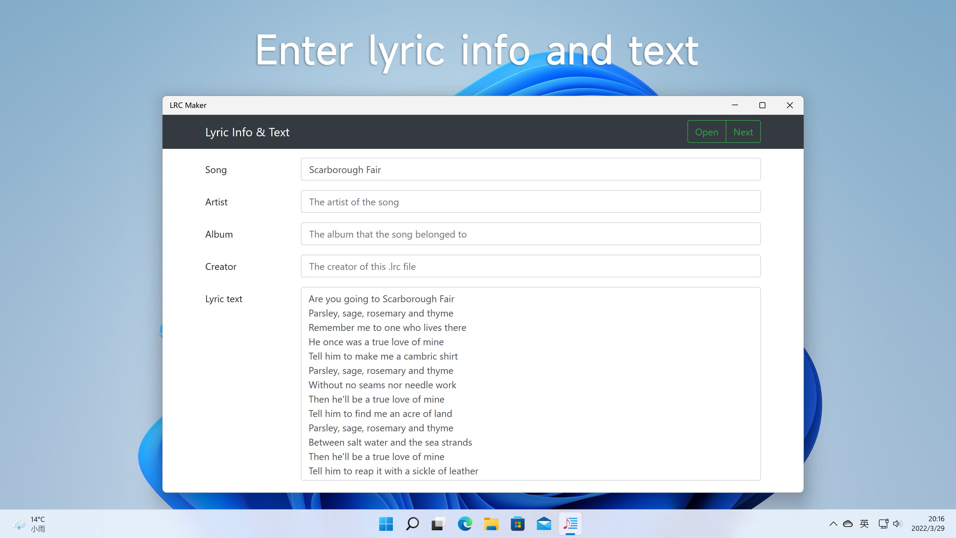 This app is a simple and easy-to-use lyric file creation tool. It can quickly create a lyric file with the .lrc extension in just a few steps.