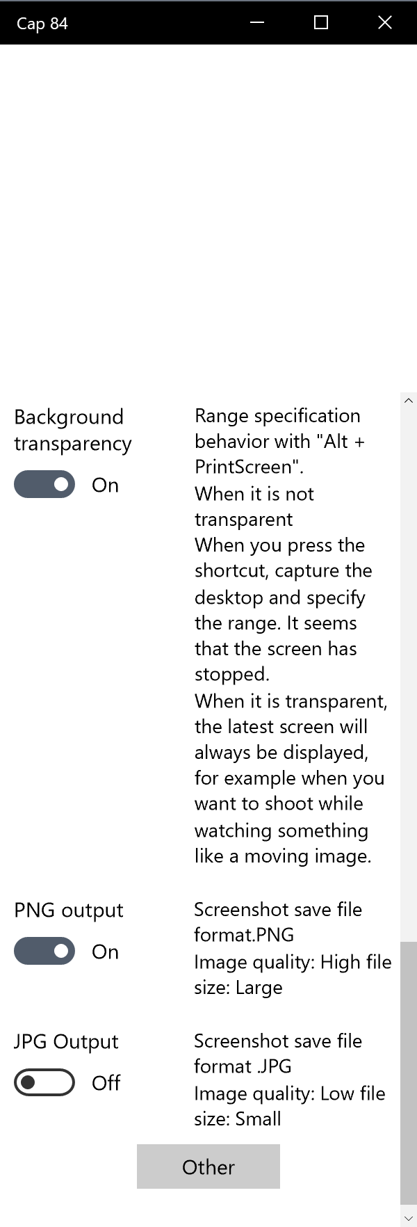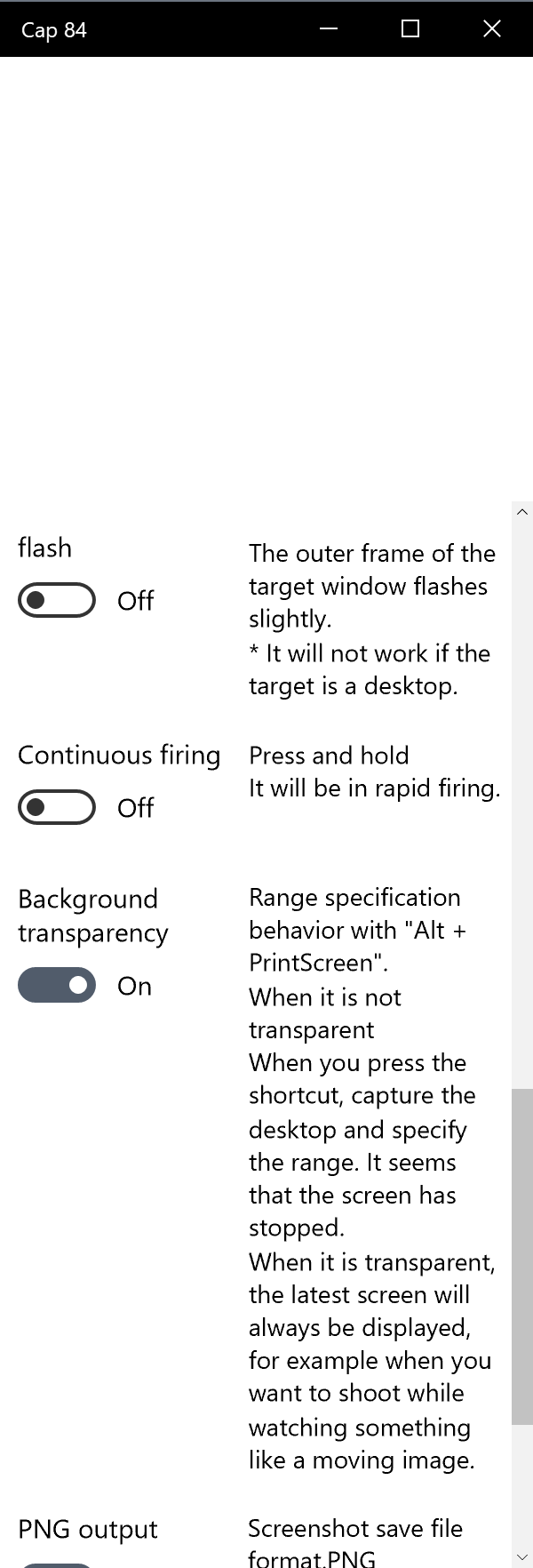 Simply press printscreen to save to fileScreenshot completion toast notification ON / OFFRectangle designation screenshot where you can freely specify range (alt + printscreen)There are two types of image file formats when saving. .Jpg .Png. You can instruct both at the same timeYou can change the operation of specifying a rectangle. You can use it according to what you want to capture and the situation at that time.Notification by flushing the window frame (not supported in some windows) Screen shot completeOne button screenshot selection range (desktop, active window, active window client area)Continuous firingCall setup screen from task tray or tile Screen shot destination specificationDisplay screenshot save destinationYou can specify the rectangle (range) by switching the drawing of the center point of the pointer.It is also possible to specify by dragging.Even if you do not have a keyboard, you can also take a screenshot by clicking the button.