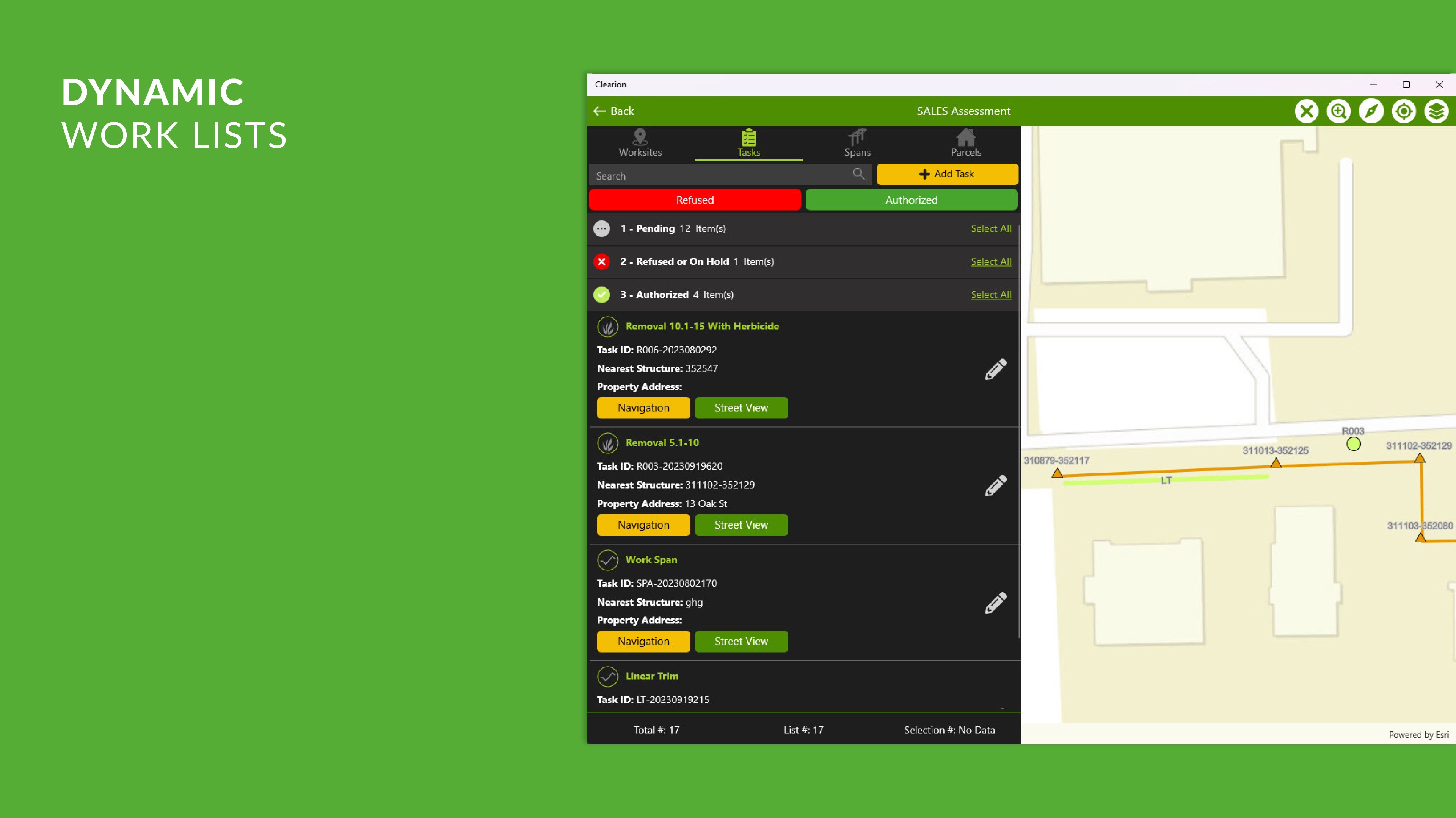 • Navigation: search for addresses, select points on the map, or choose tasks on the work list to build multi-stop routes to find the most efficient plan for the day, and then engage turn-by-turn directions to navigate to the next stop