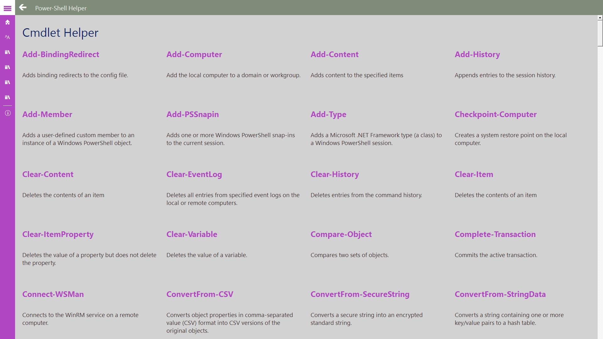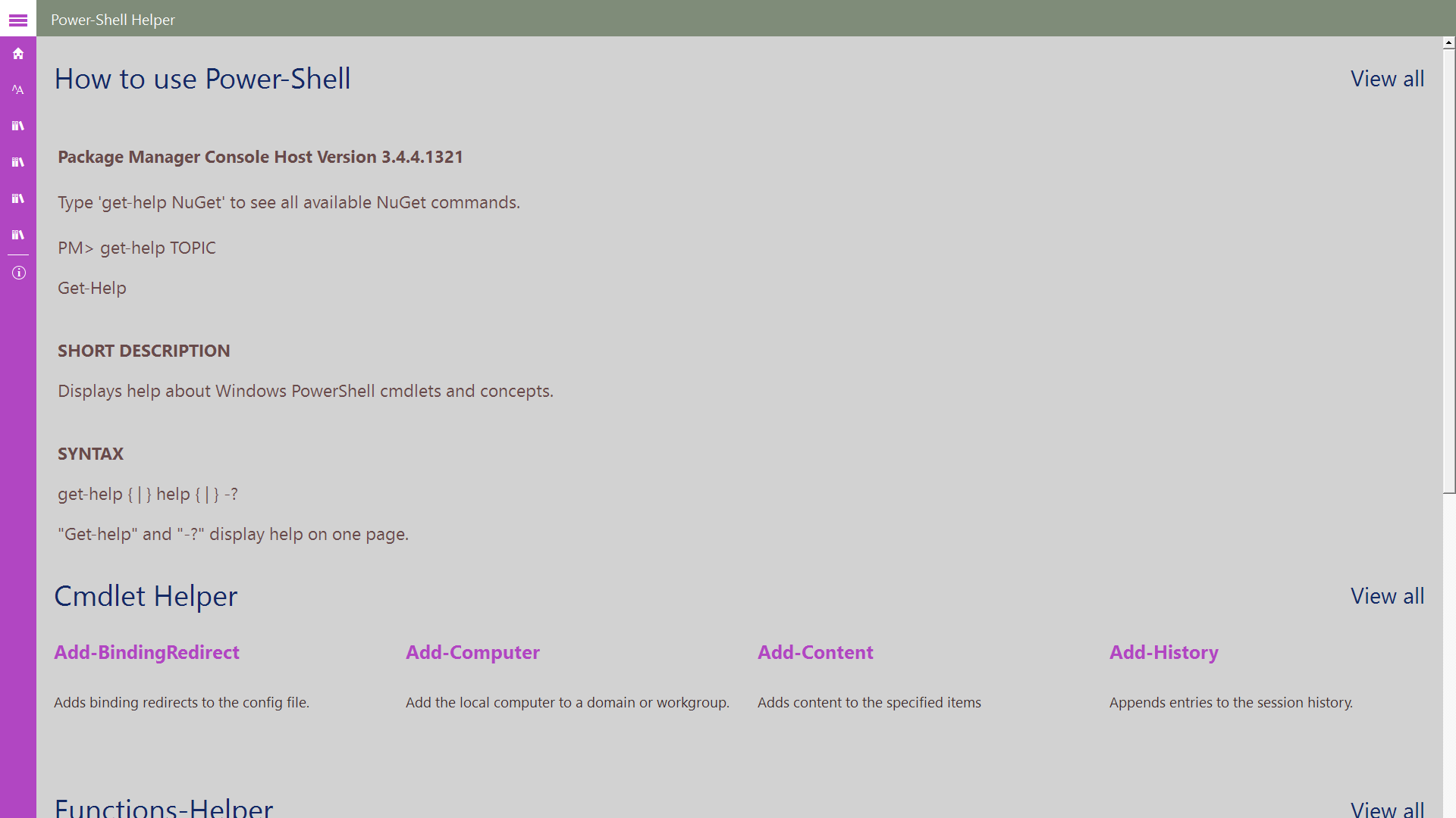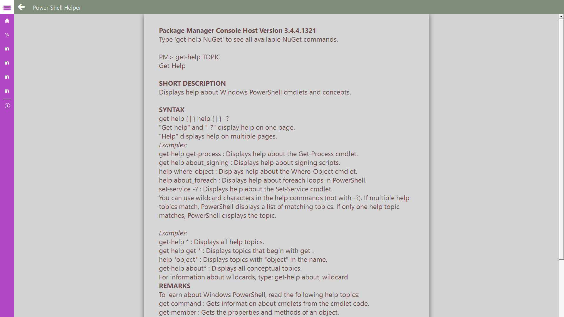 Power-Shell Helper app helps the developer to understand power shell commands, alias, and how to use Power-Shell easier. This app acts as quick start up quide to learn Power-Shell.