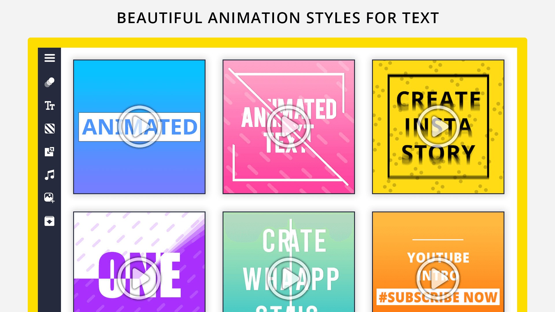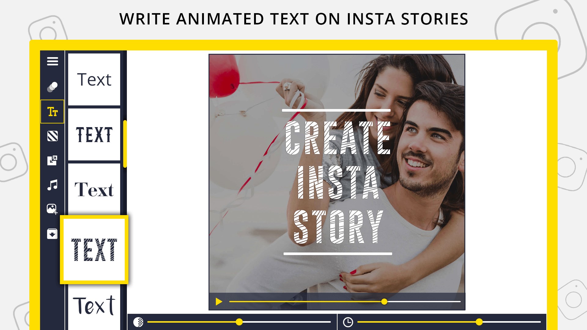 Different Text Animation Styles for creating your Animated VideoTons of Color Combinations to make your Instagram Story Video attractiveTons of Fonts to write your Inspiring Animated QuotesChoose your Own Music Or use from our Music LibraryAdd your own Pics as background for your animations