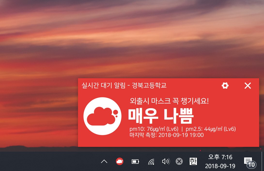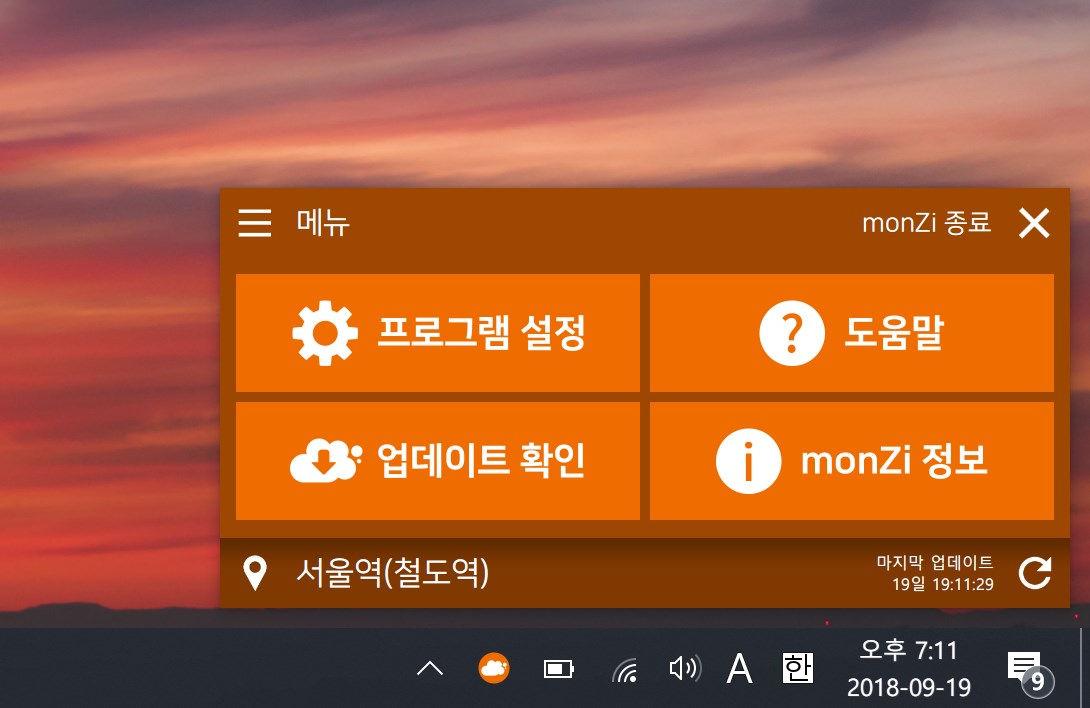 monZi는 미세먼지와 초미세먼지 정보를 실시간으로 업데이트하고 알려주는 실시간 대기정보 조회·알림 프로그램으로, 모바일 플랫폼을 넘어서서 많은 직장인이나 학생, 선생님, 관련 종사자들 등이 오랜 시간 업무에 이용하고 있는 PC 플랫폼에서도 대기 상태를 업데이트 받아 환기 여부 등을 판단할 수 있도록 도와주자는 취지로 제작한 Windows 응용 프로그램입니다.