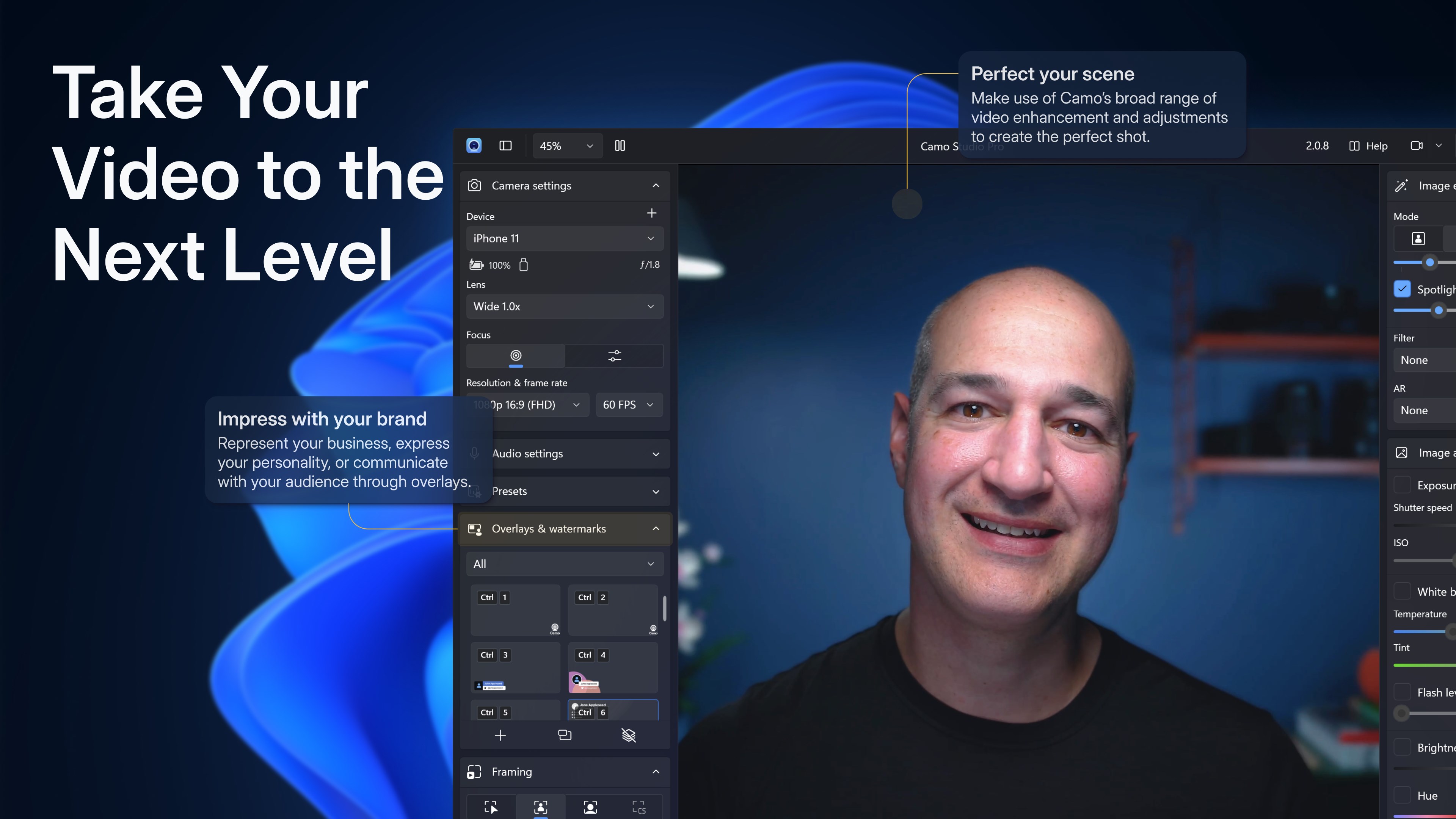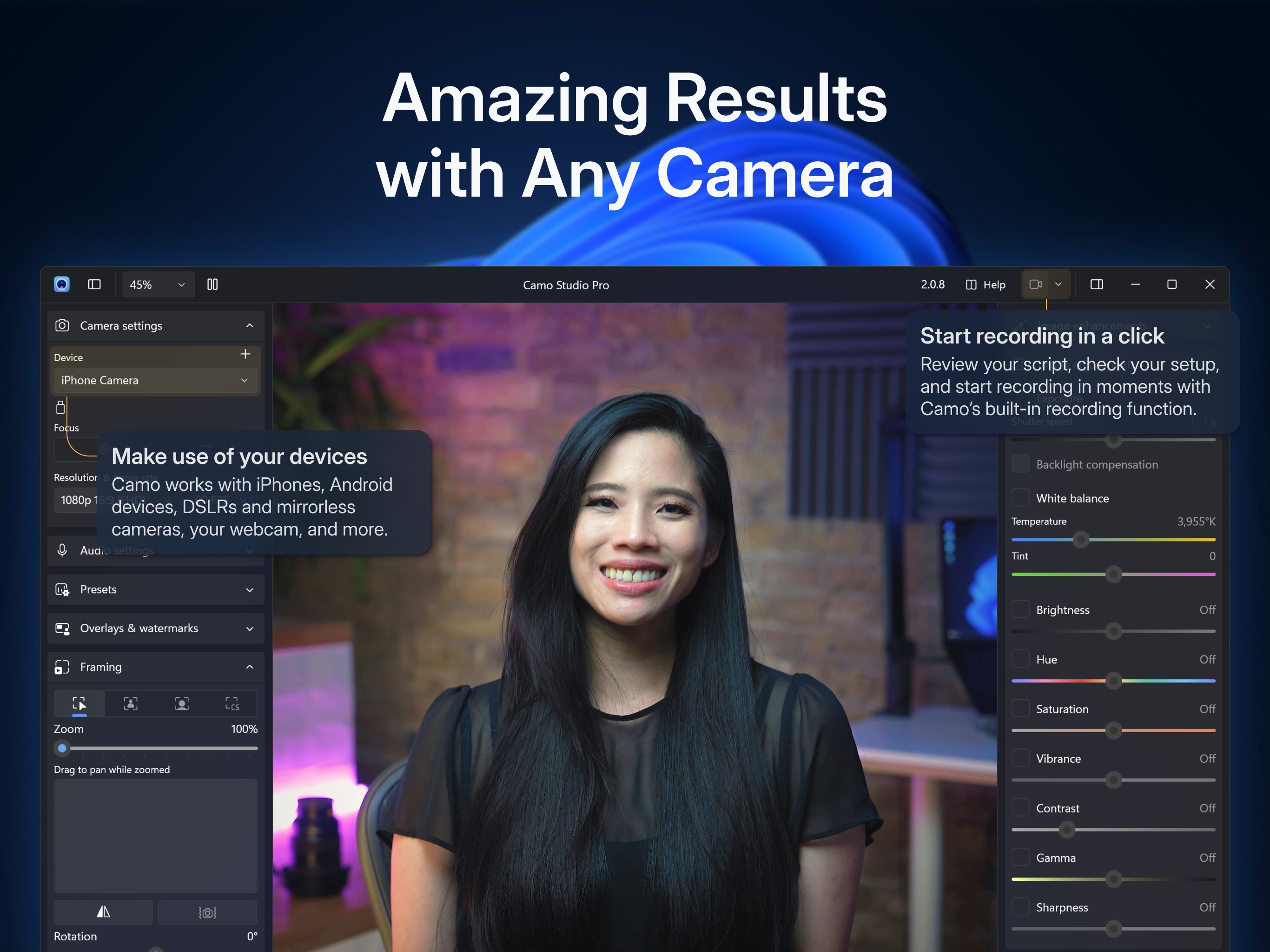 Camo uses the incredible cameras you already own to produce pro-quality video, whether you’re meeting, streaming, or recording. Its intuitive interface is right at home on your PC, and is compatible with all the apps you already use.