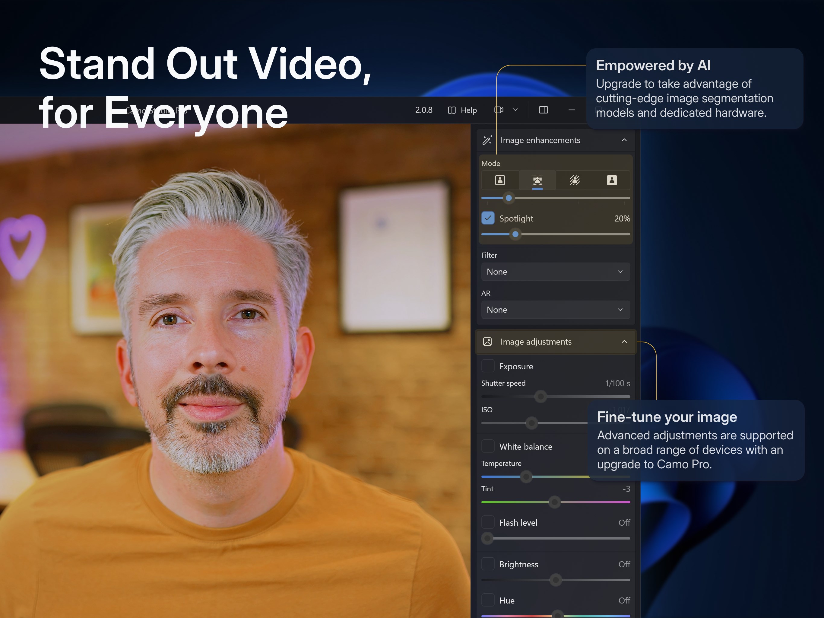 Camo Studio gives you full control of your video, letting you adjust lenses, exposure, colours, contrast, and more; and it lets you zoom, crop, and focus your image precisely how you want it. Apply cinematic styling and colour grading to your video with 18 bespoke filters, including support for custom Cube, 3DL, and LUT files.