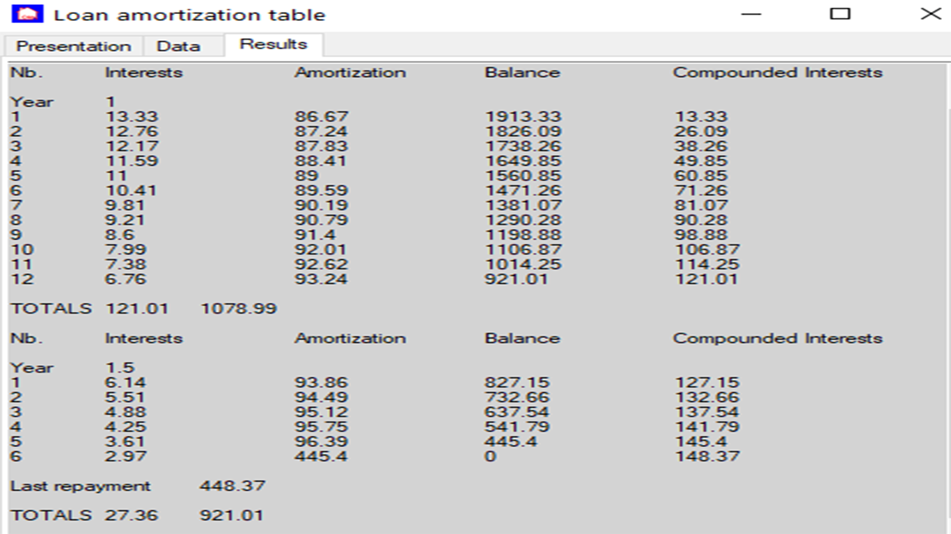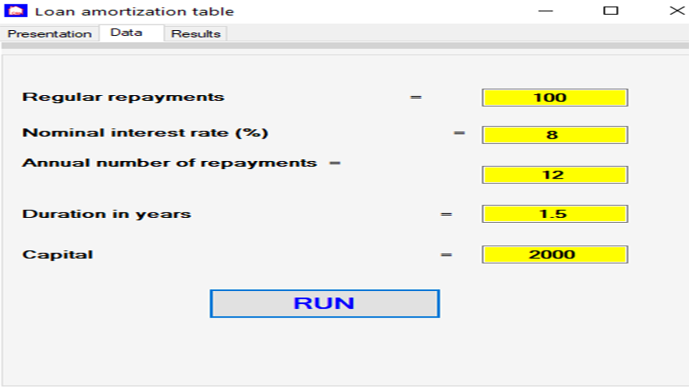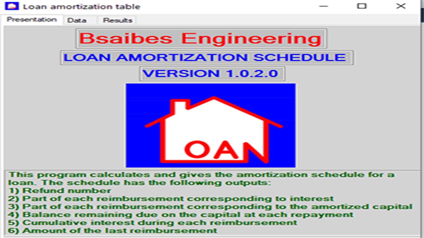 This program calculates and gives the amortization schedule for a loan. The schedule has the following outputs: