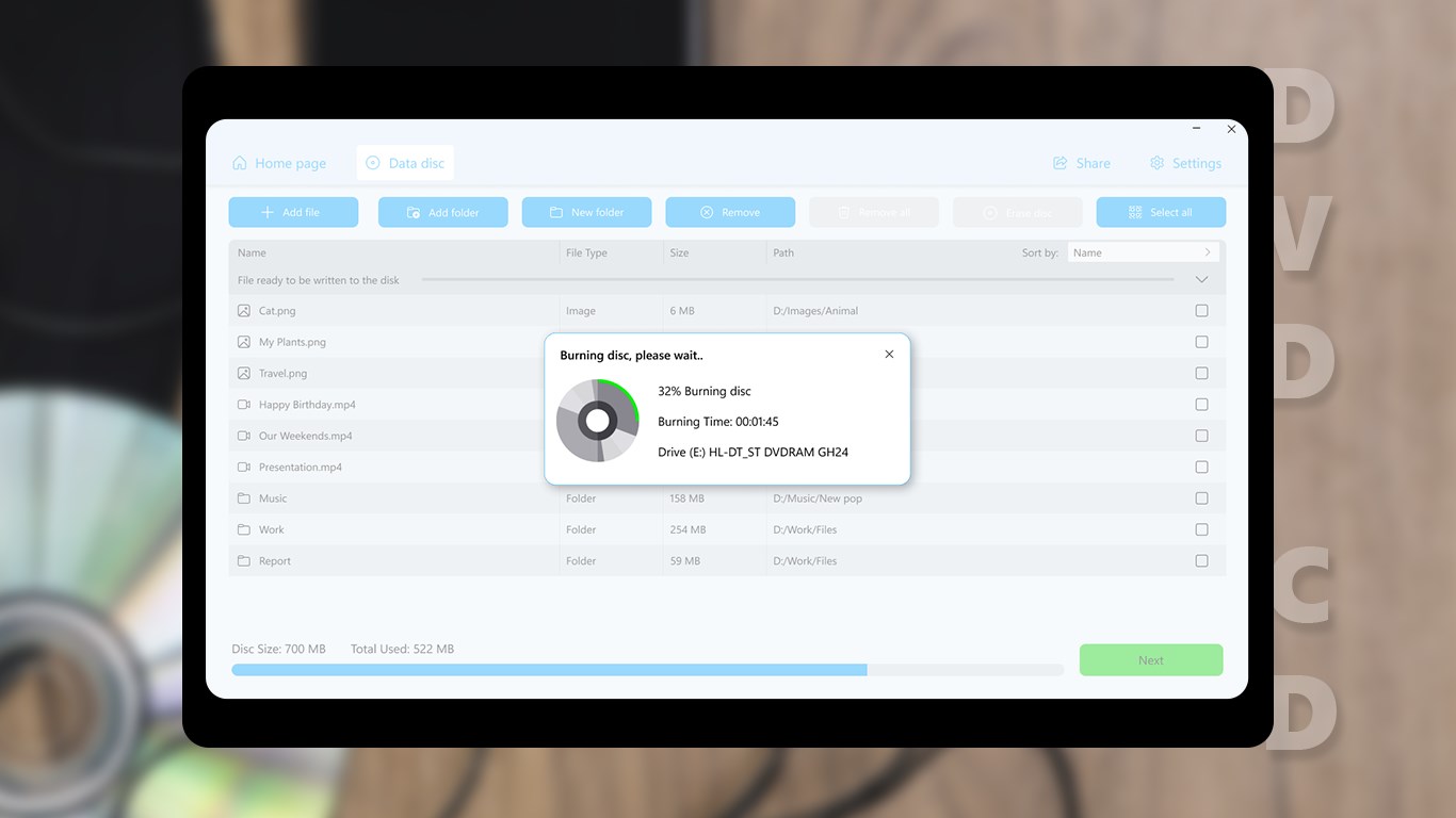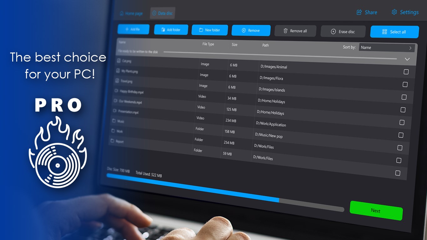 DVD CD Blu-ray Burner PRO is a fast and convenient app to burn and store your music, movies and any other data on discs, including CD-R, CD-RW, DVD-R, DVD-RW, Mini DVD-R, Mini DVD-RW, Blu-ray-R, Blu-ray-RW.