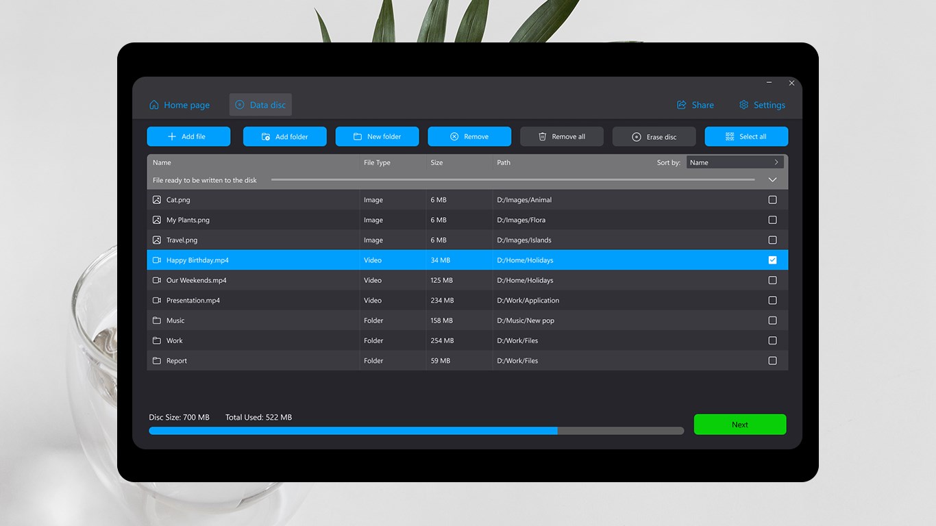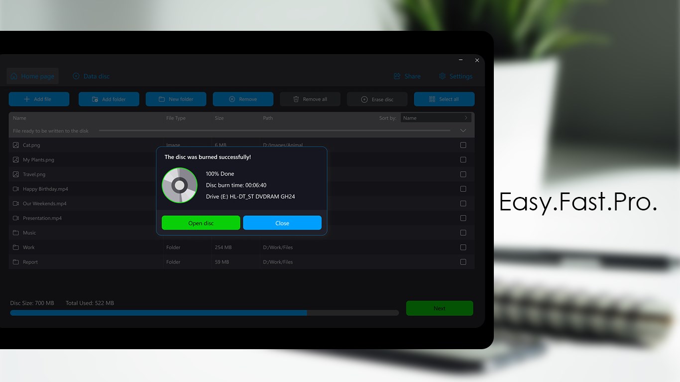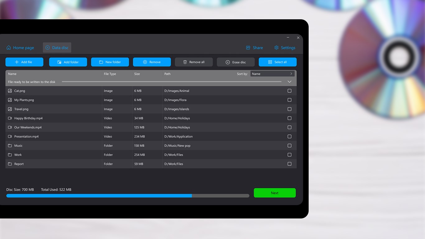 Supported discs CD-R, CD-RW, DVD-R, DVD-RW, Mini DVD-R, Mini DVD-RW, Blu-ray-R, Blu-ray-RWFor audio and video files burning MP3, MP4, WAV, WMA and lots of other formats may be usedA single file can be added as well as a folderDrag&Drop option allows to add the necessary files easilyMulti-language interface