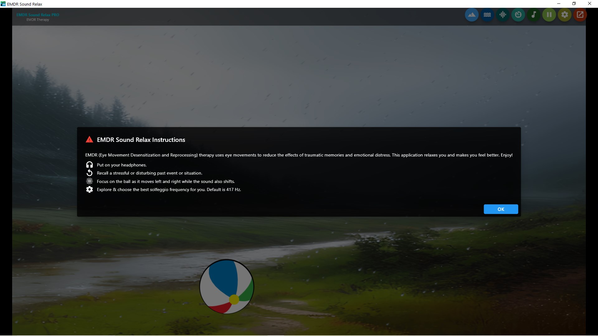EMDR Therapy: Try Eye Movement Desensitization and Reprocessing (EMDR) therapy with a moving seaball and peaceful landscape scenery such as a rainy forest, snow, lake, and sea, The headphone sound balance is adjusted according to the ball's movement to the right or left.