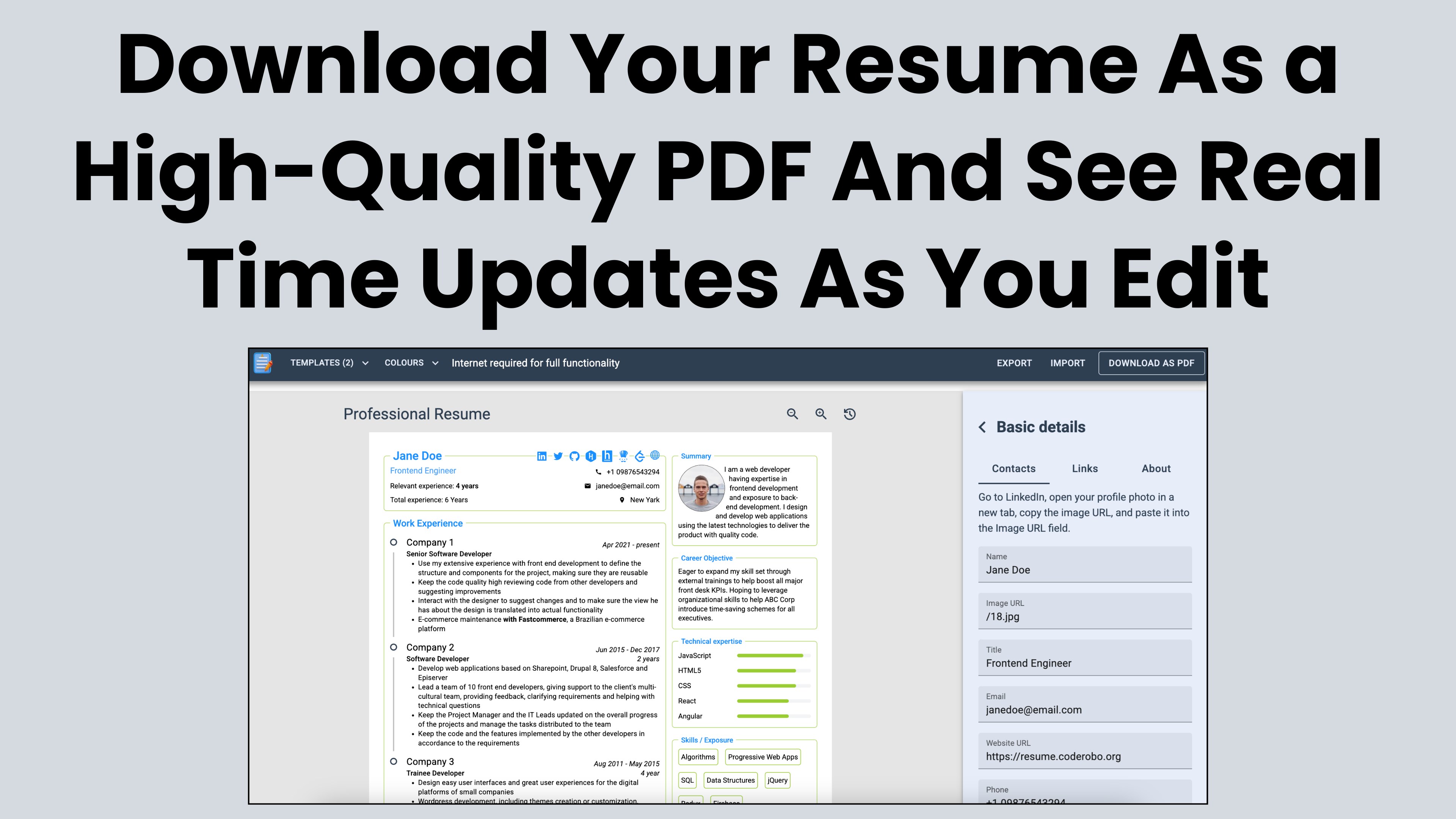 With an easy-to-use interface and powerful features, you can create, edit, and save your resume effortlessly—even offline! Plus, our export and import feature ensures you never lose your progress. If you're in a hurry, simply export your resume data in JSON format and import it later to continue exactly where you left off.